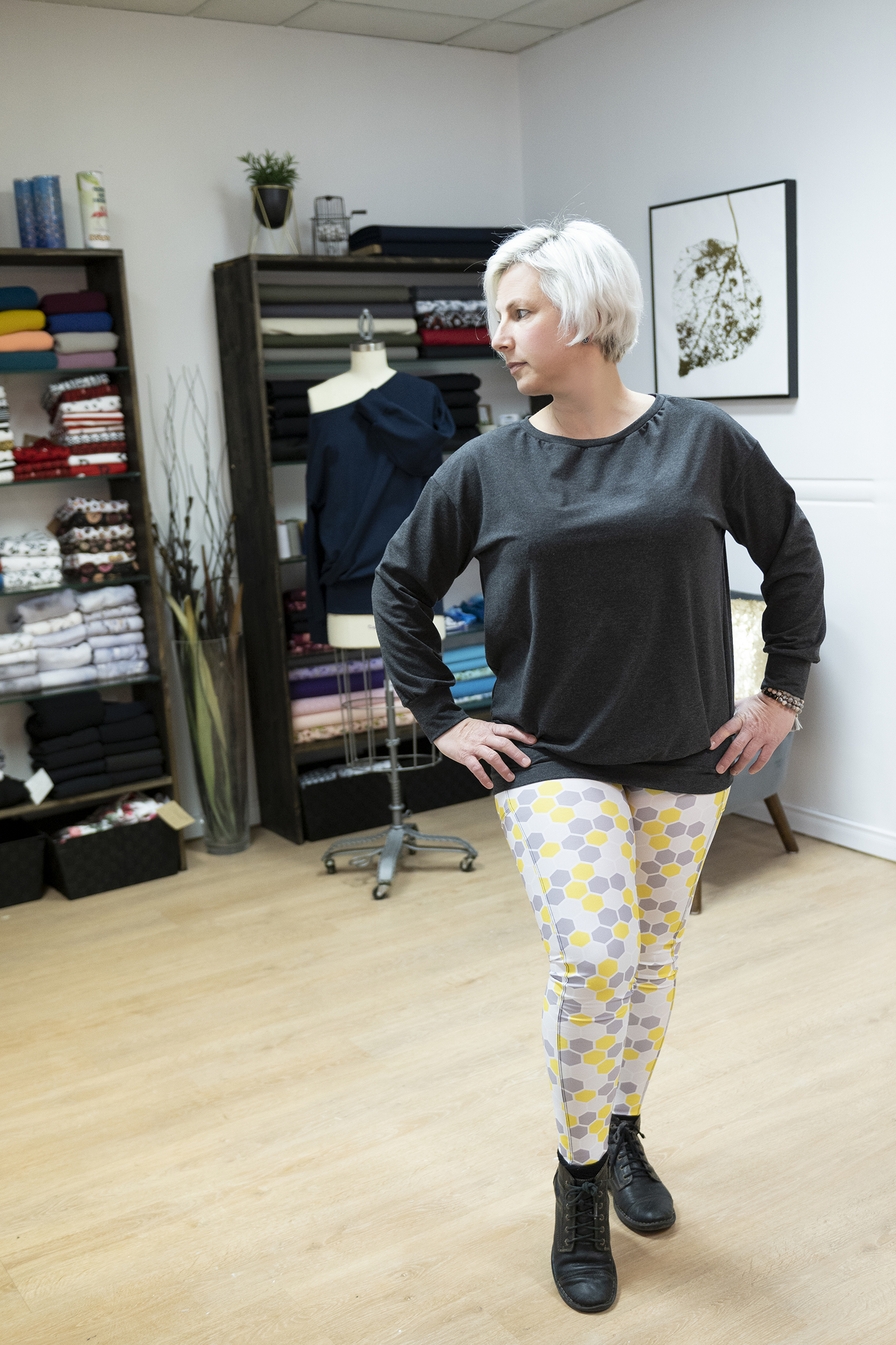 Legging confectionné dans le textile Chitosanté à compression moyenne, offrant un maintien équilibré, une extensibilité confortable et une sensation douce au contact de la peau. Réalisé avec le motif Spring Fling – Ruche jaune et gris, il combine performance textile et esthétique graphique.