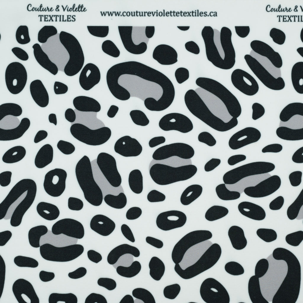 Tissus imprimés avec motifs d'inspiration peau de guépard de couleur blanche avec tâches noires et grises dans la collection Animal texture, design unique avec un choix de tissus écoresponsable.