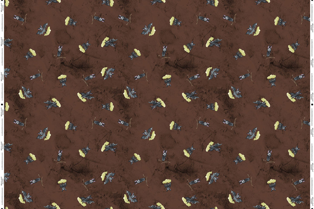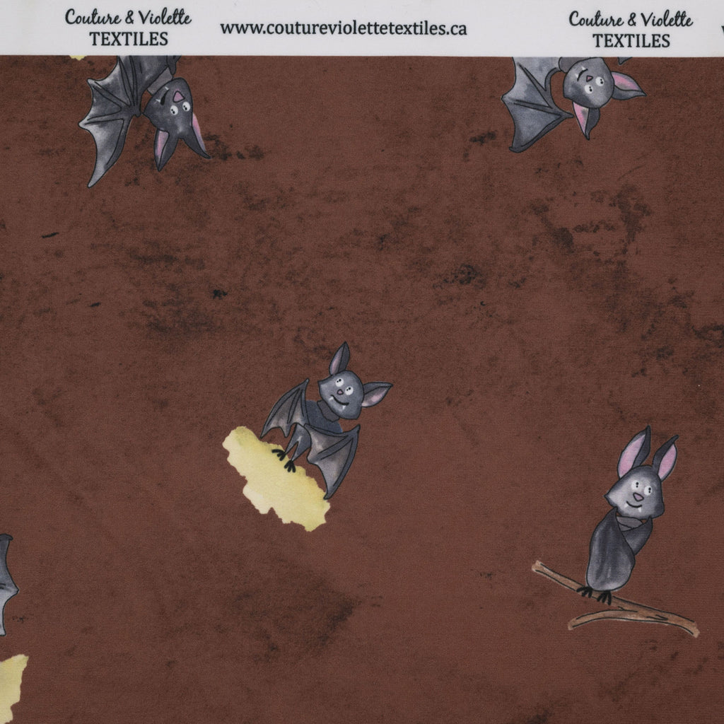 Printed fabric with large bats on a brown background from the Halloween collection, unique design with a choice of eco-responsible fabrics.