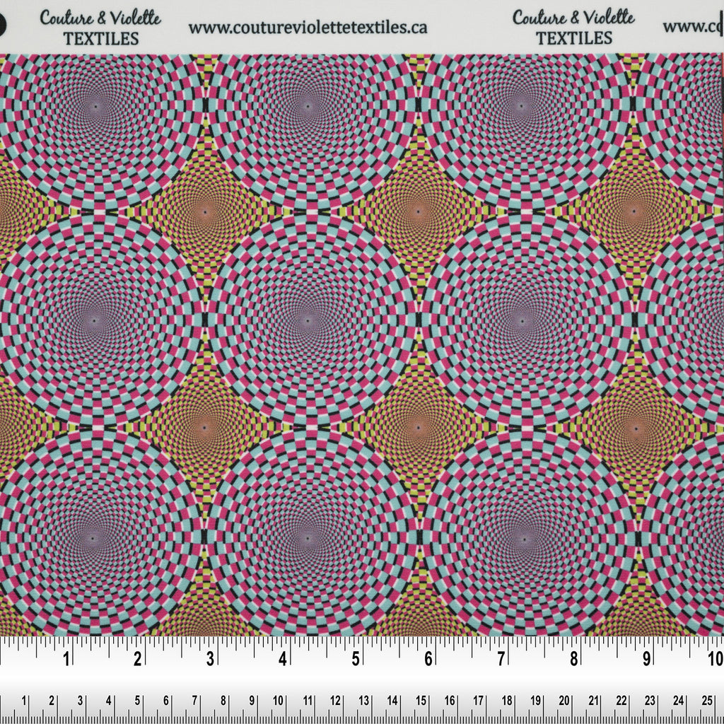 Optical illusion pattern creating a mesmerizing effect, when looking at the small black dot, it looks like the pink rectangles are moving outwards. Exclusive design with a choice of eco-responsible fabrics.