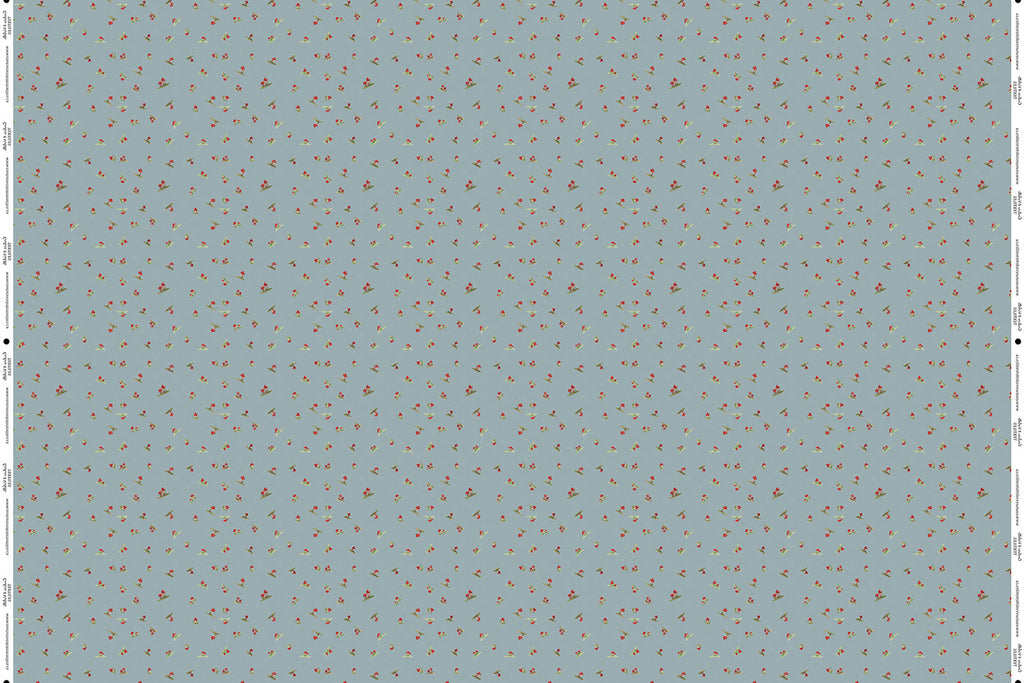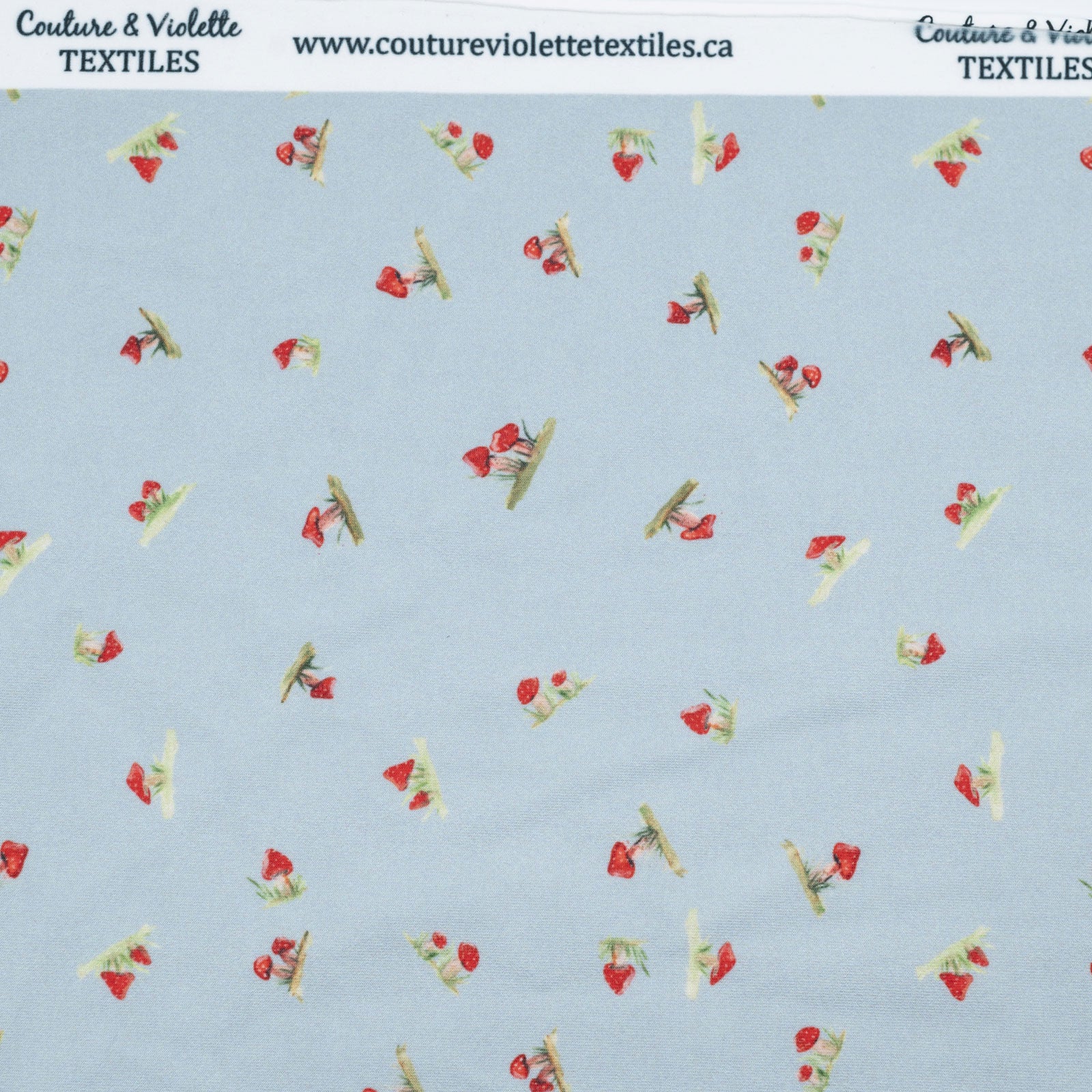 Printed fabric with patterns of small red mushrooms on a cloudy blue background from the Small mushrooms collection, unique design with a choice of eco-responsible fabrics.