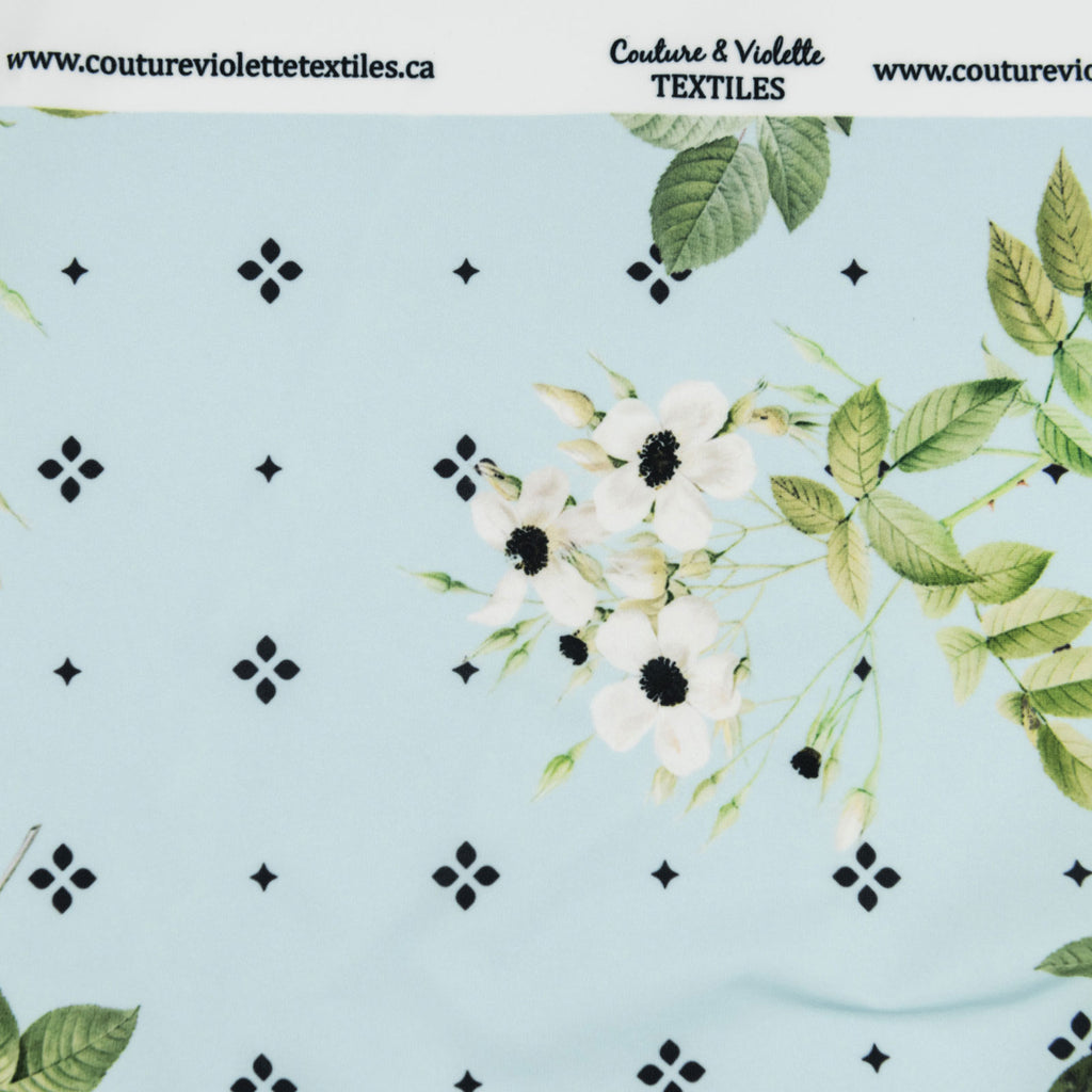 Printed fabric with patterns of large anemones flowers on an ice blue background in the flower - anemone collection, unique design with a choice of eco-responsible fabrics.