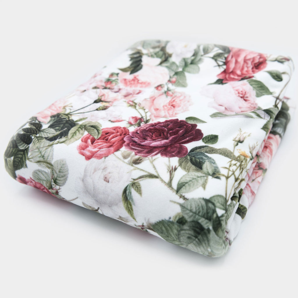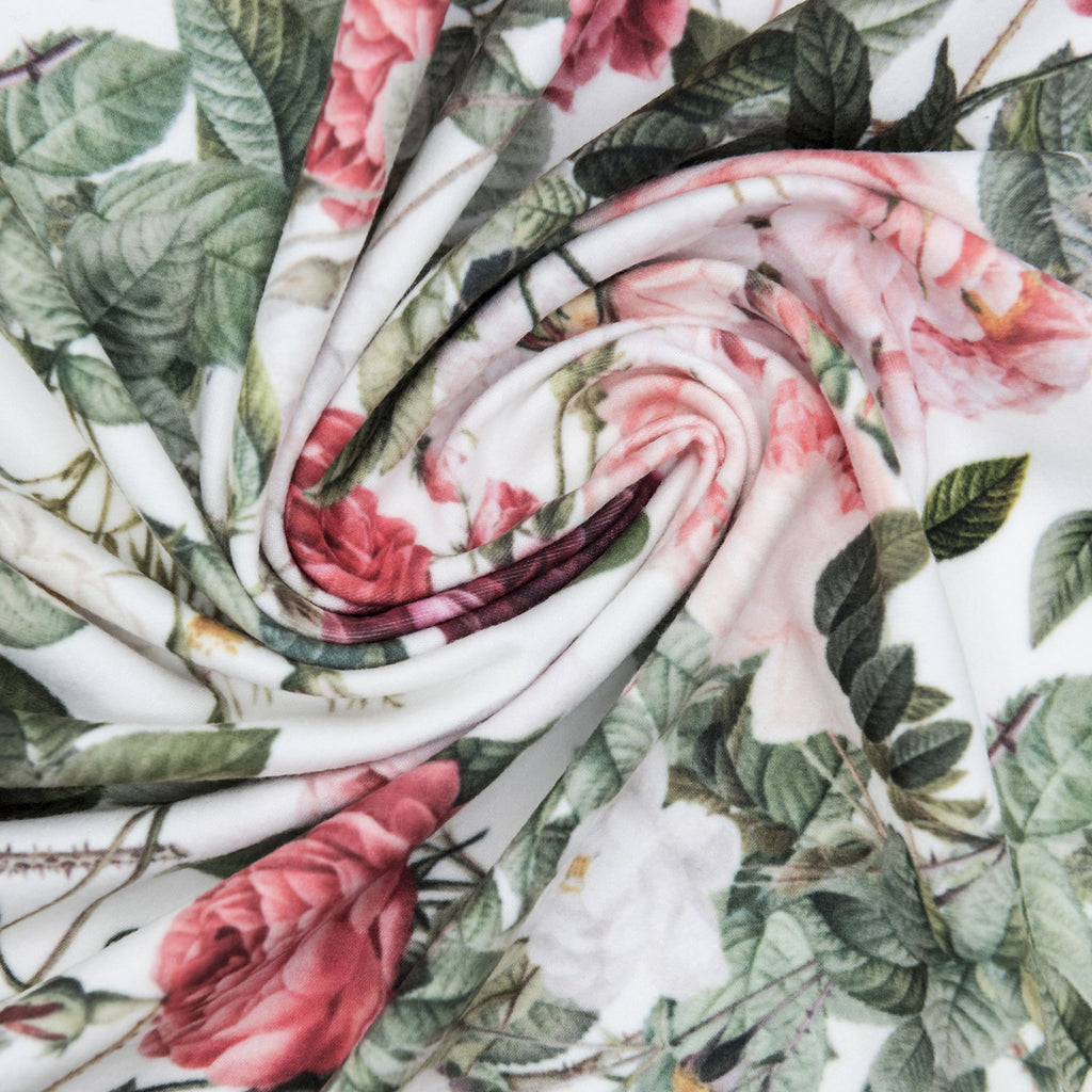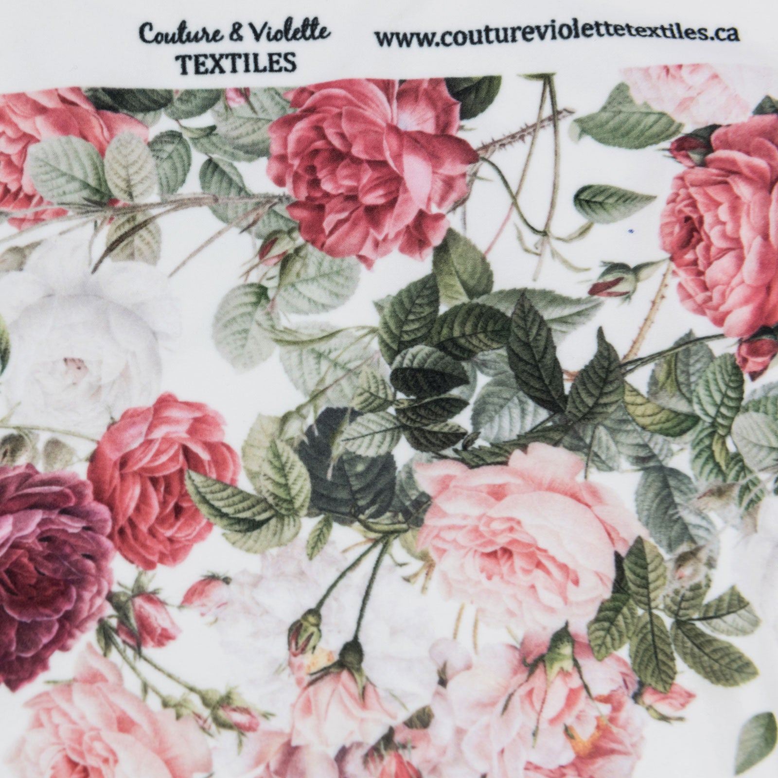 Printed fabric with rose patterns on a white background in the unique design rose garden collection with a choice of eco-friendly fabrics.