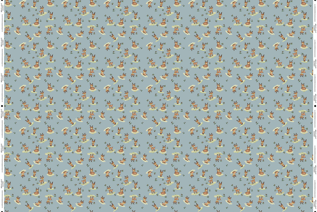 Printed fabric with patterns of small deer on a cloudy blue background from the Small Animals collection, unique design with a choice of eco-responsible fabrics.