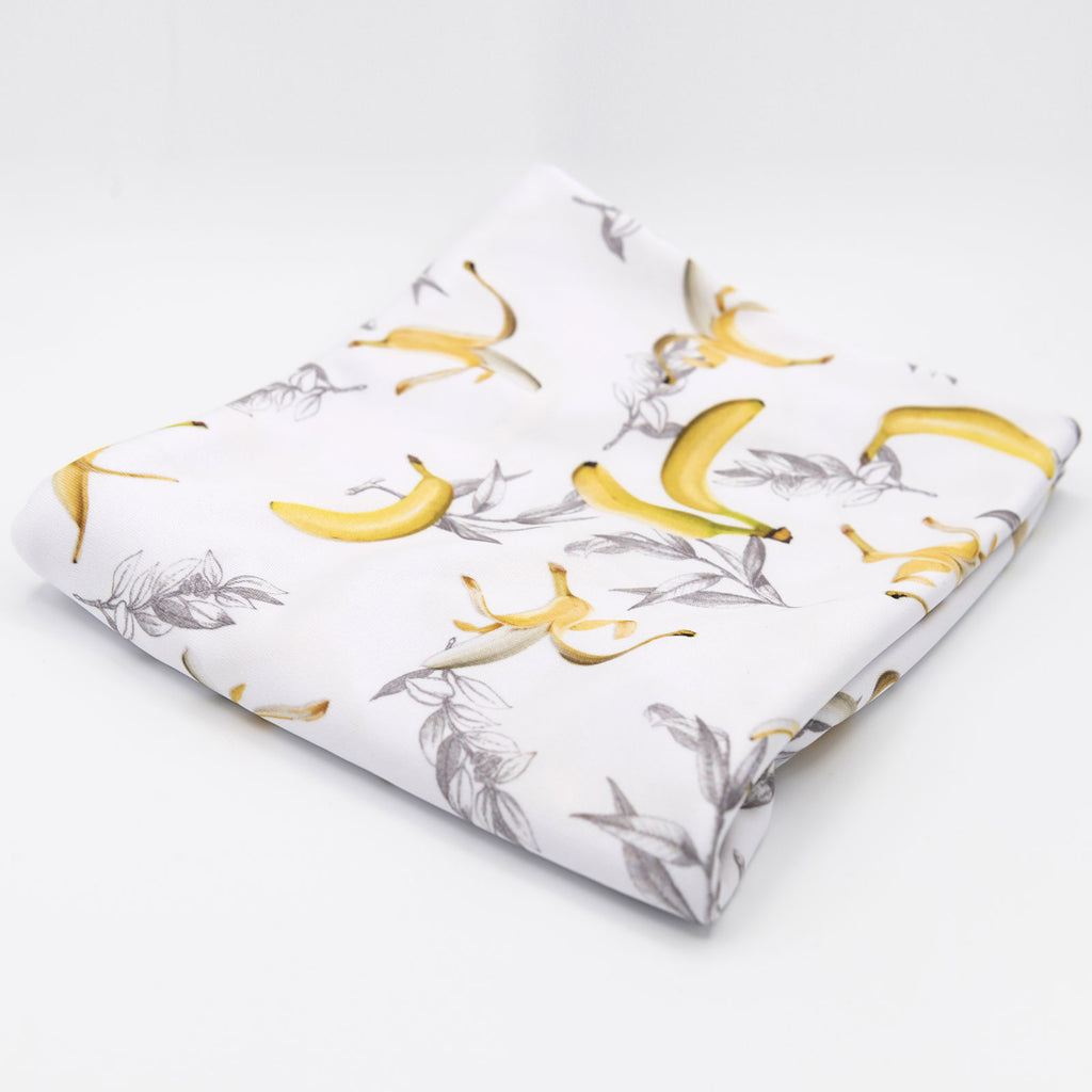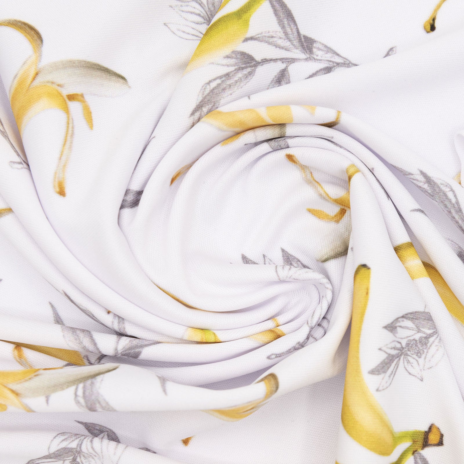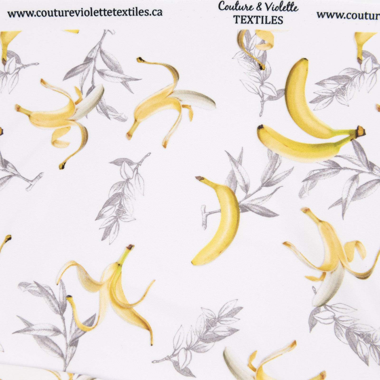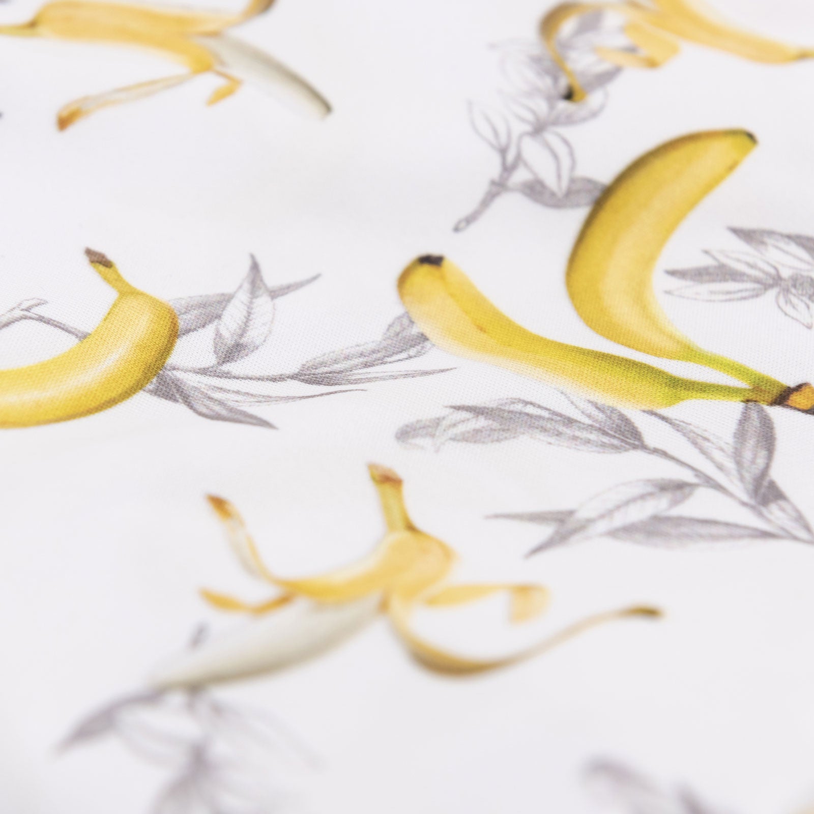 Printed fabric with banana patterns on a white background in the unique design fruit salad collection with a choice of eco-friendly fabrics.
