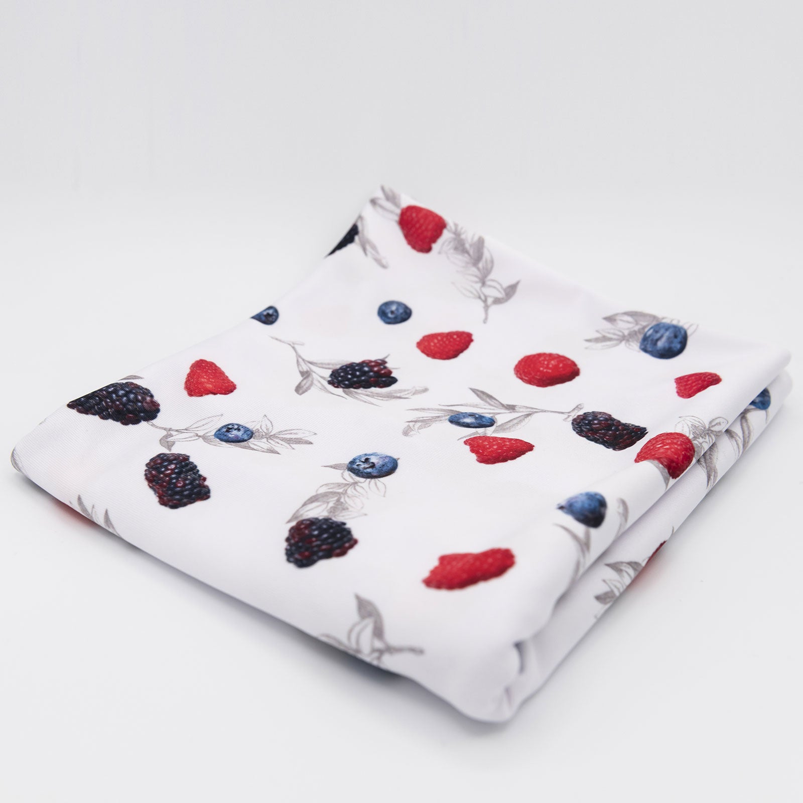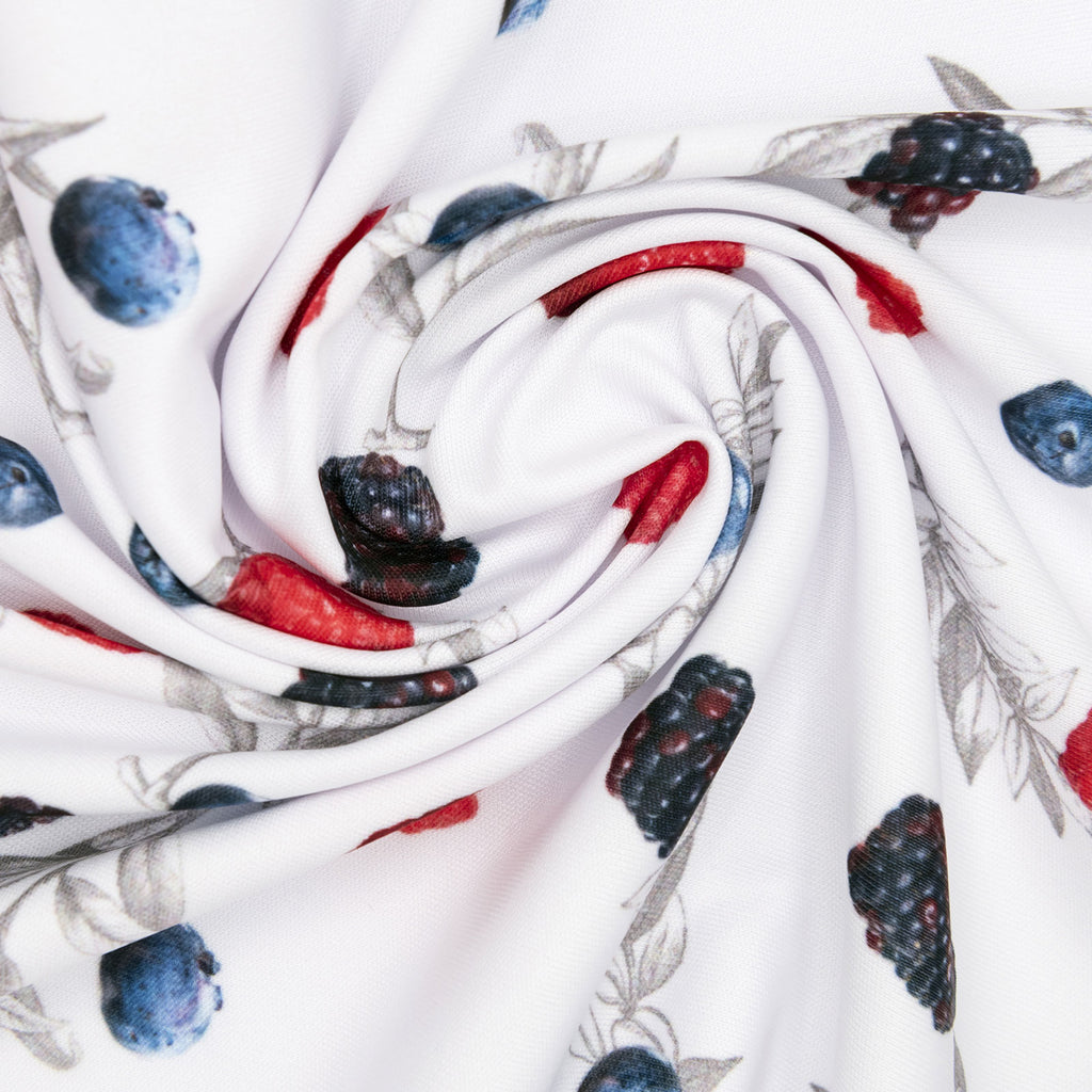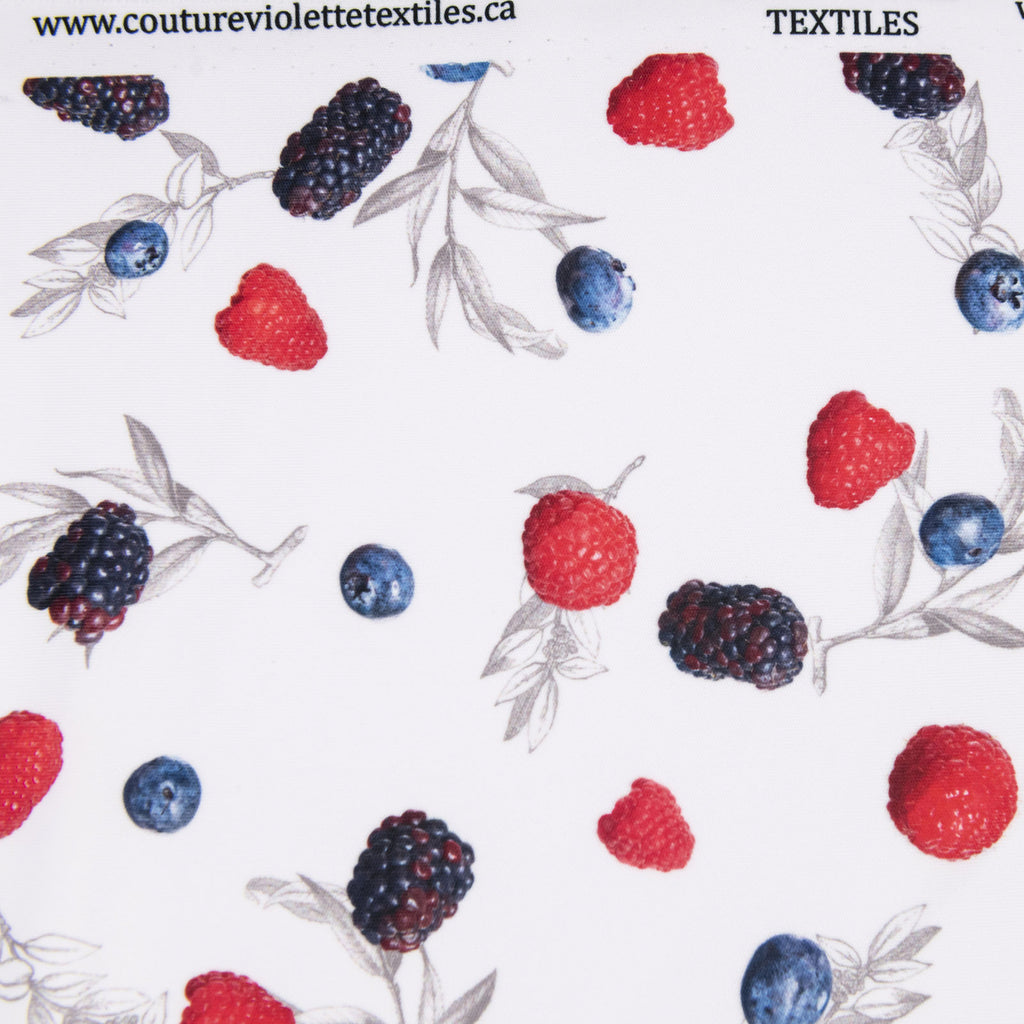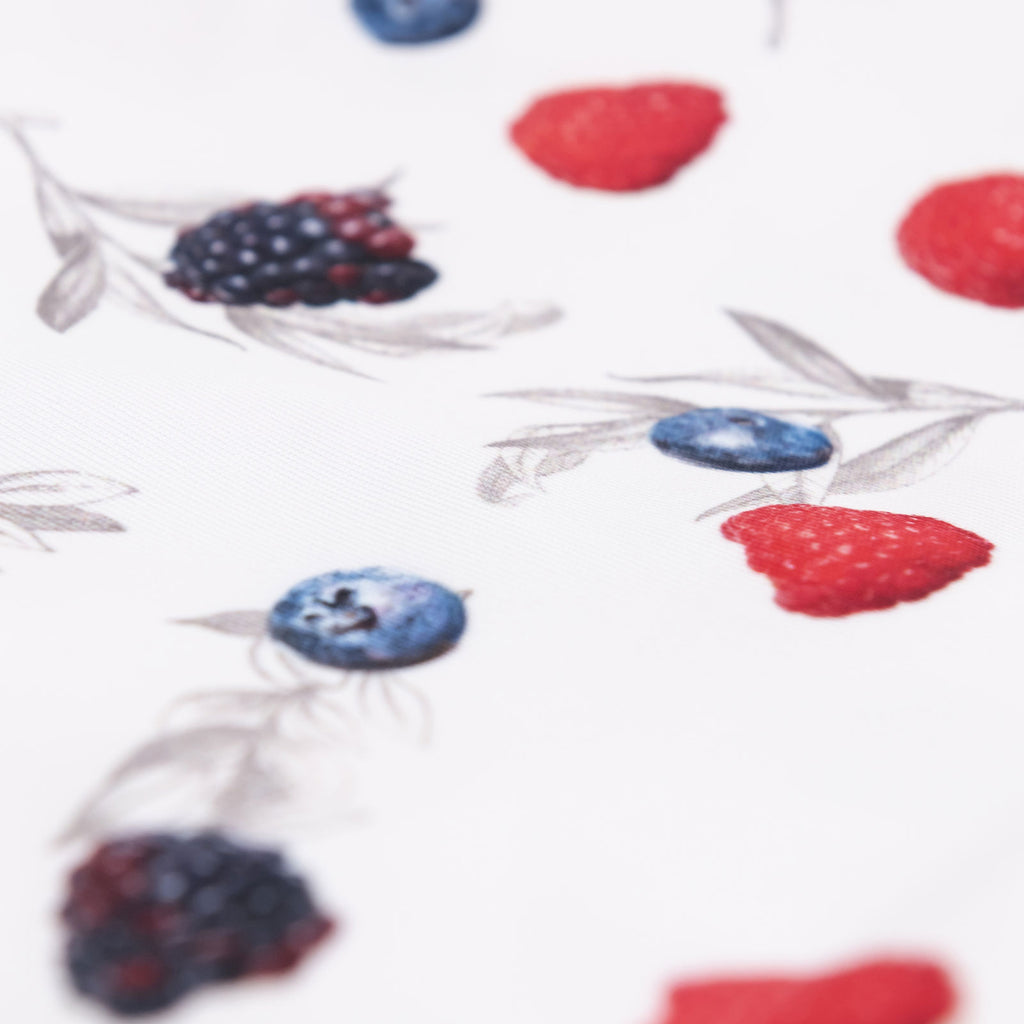 Printed fabric with berry patterns on a white background in the unique design fruit salad collection with a choice of eco-responsible fabrics.