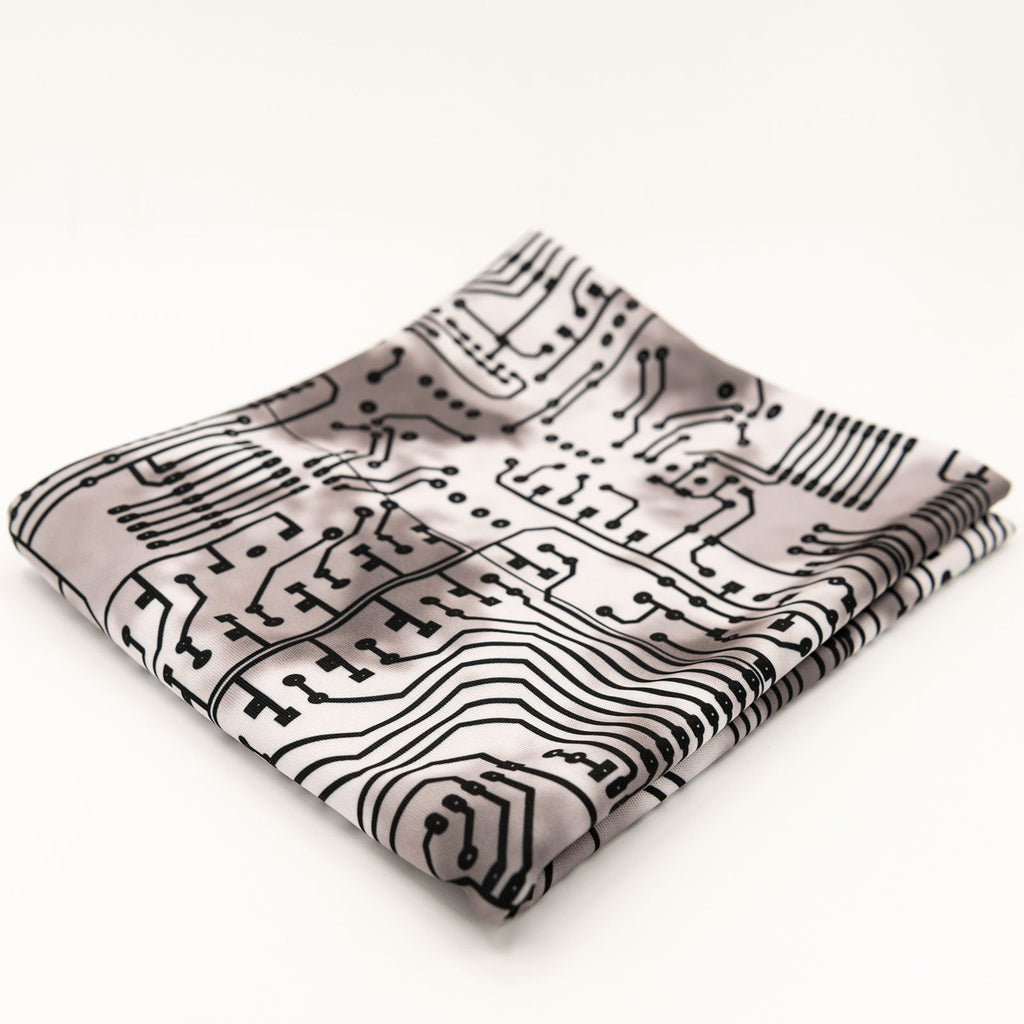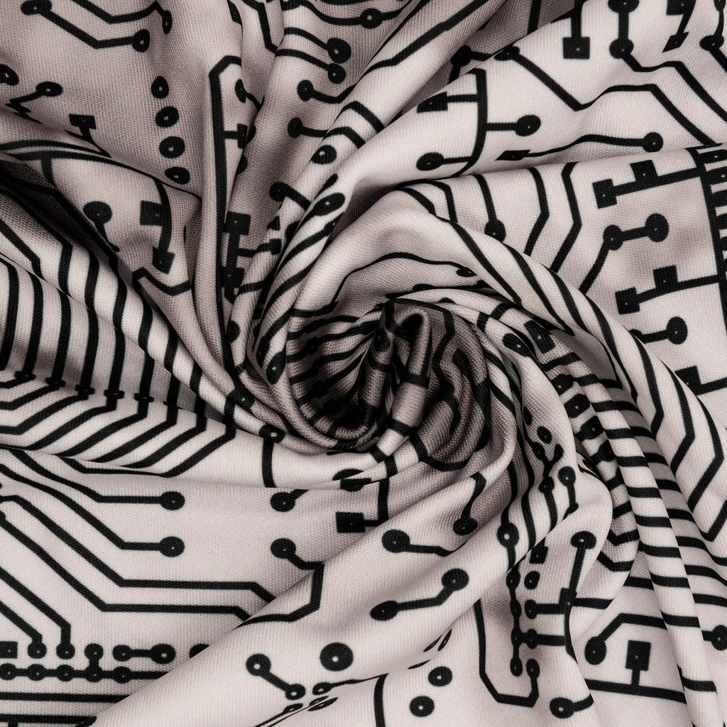 Printed fabric with small black printed circuit patterns on a gray background in the techno collection - unique design circuit with a choice of eco-responsible fabrics.