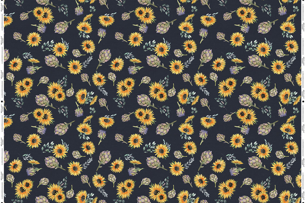 Tissu imprimé avec motifs de grands artichauts et tournesols sur fond bleu après minuit dans la collection Artichaut et tournesol, design unique avec un choix de tissus écoresponsable.