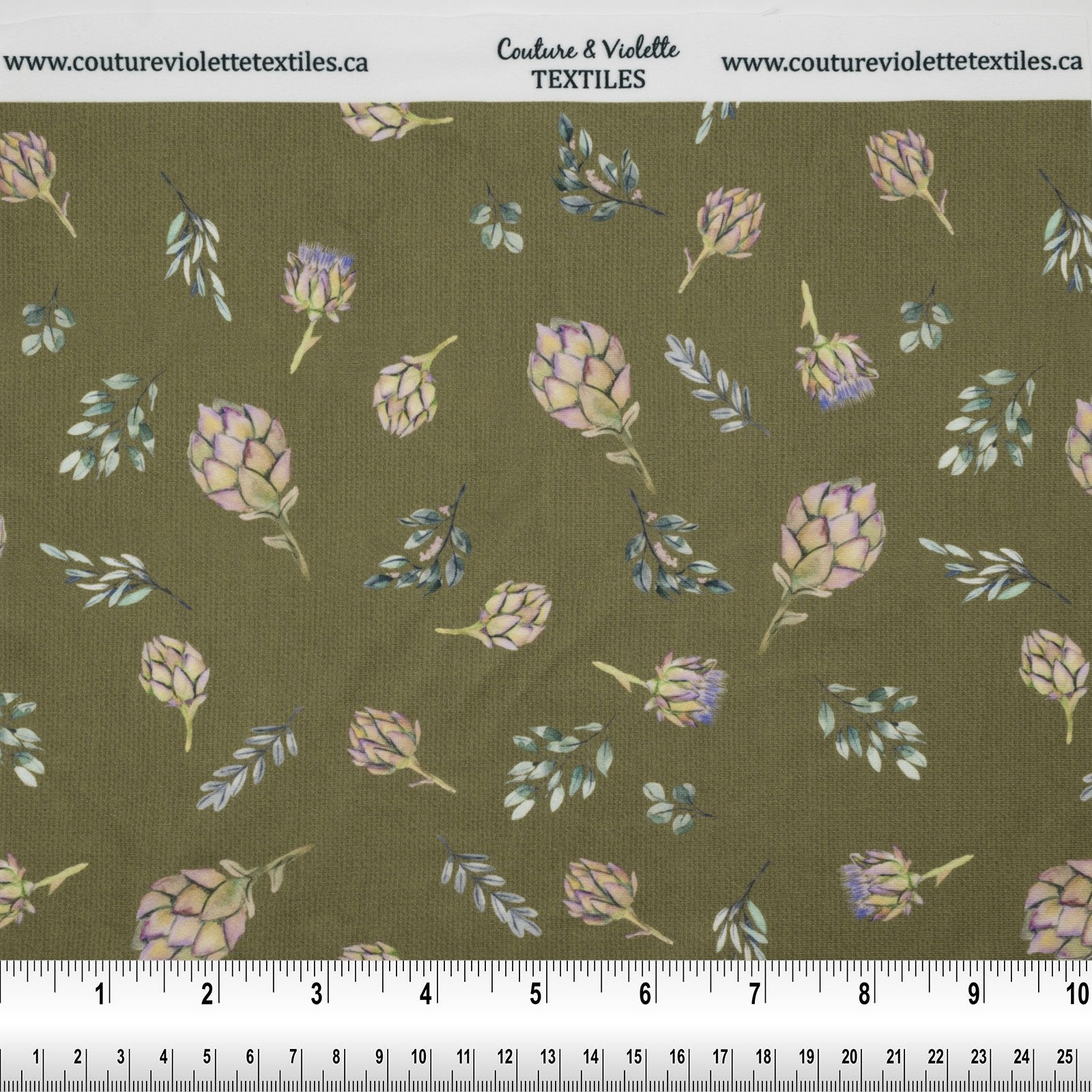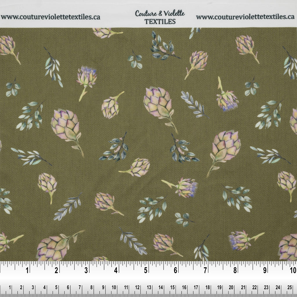 Tissu imprimé avec motifs de petits artichauts et tournesols sur fond olive dans la collection Artichaut et tournesol, design unique avec un choix de tissus écoresponsable.