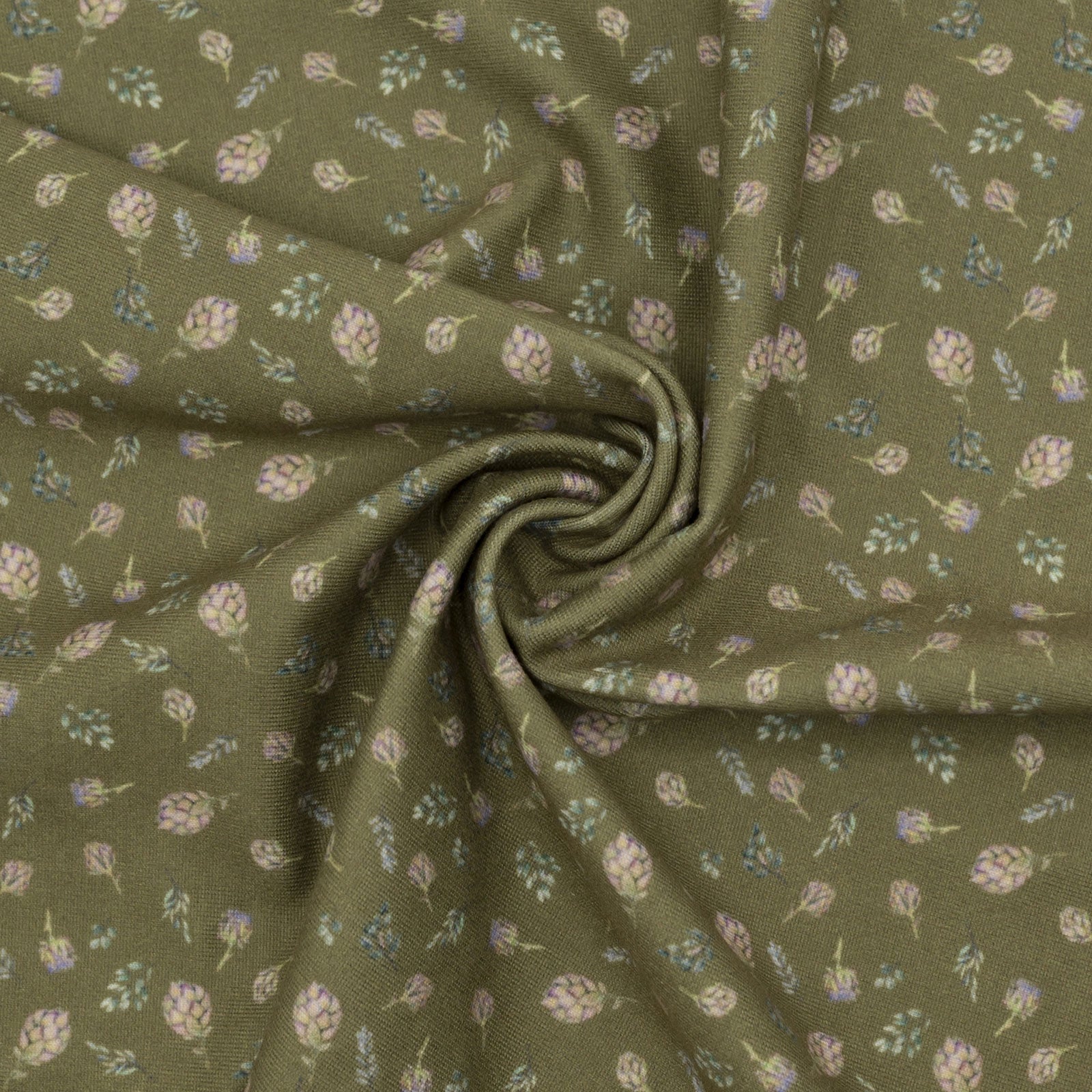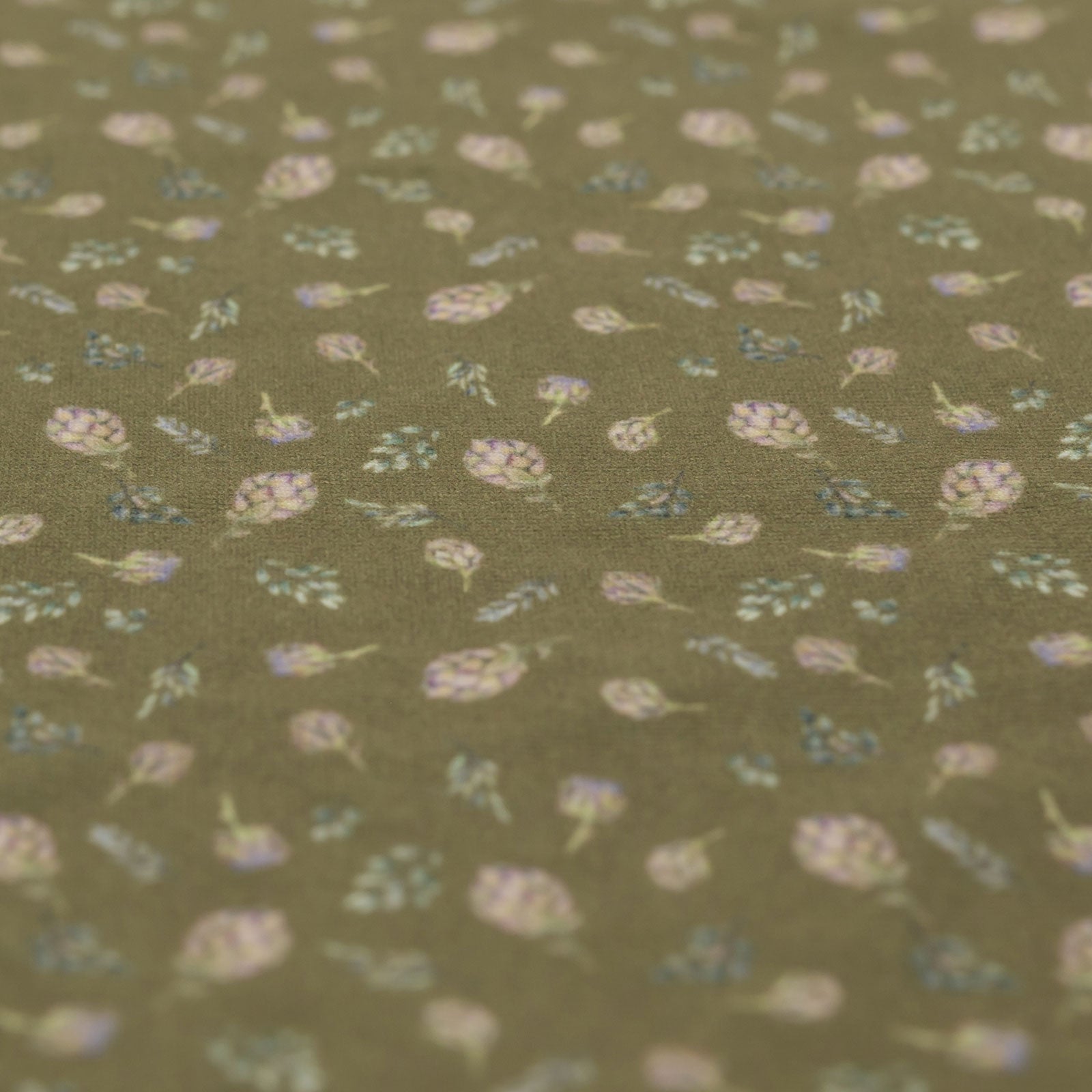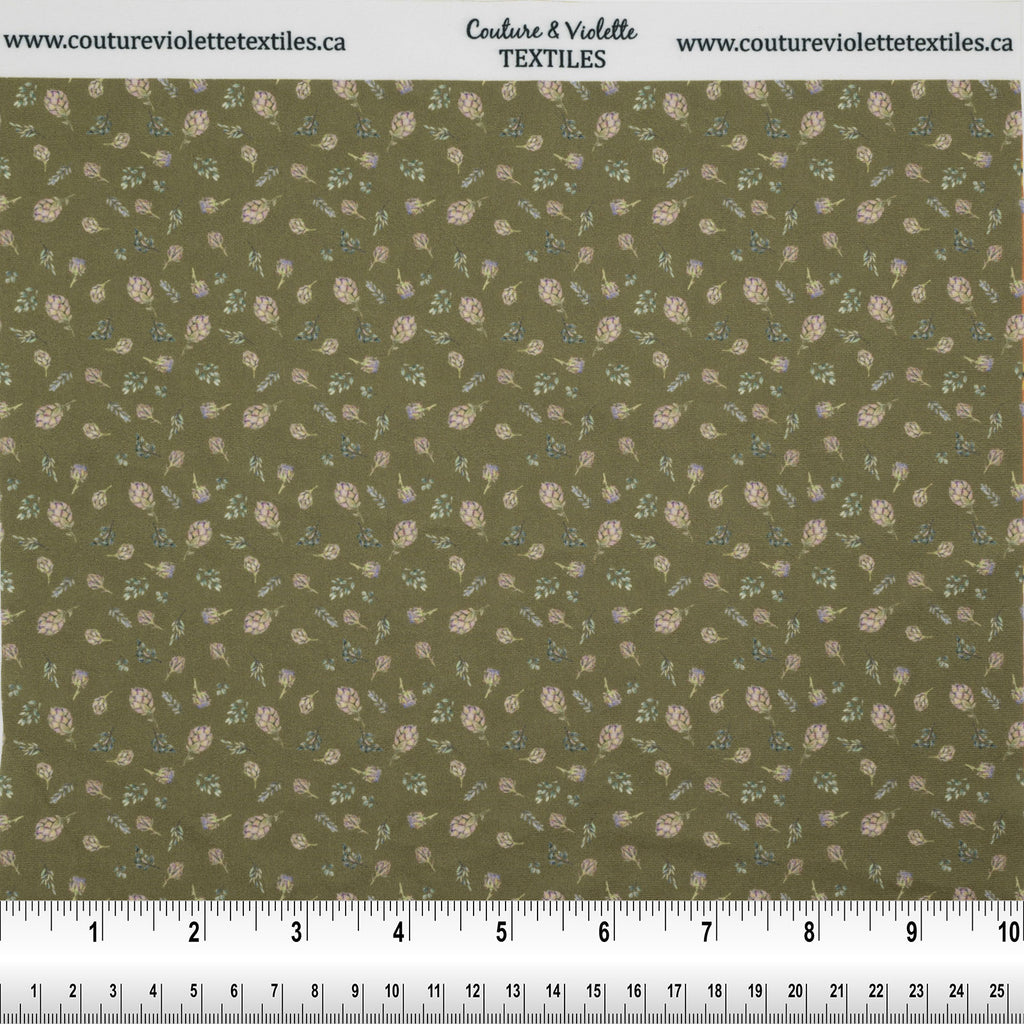 Tissu imprimé avec motifs de micros artichauts sur fond olive dans la collection Artichaut et tournesol, design unique avec un choix de tissus écoresponsable.