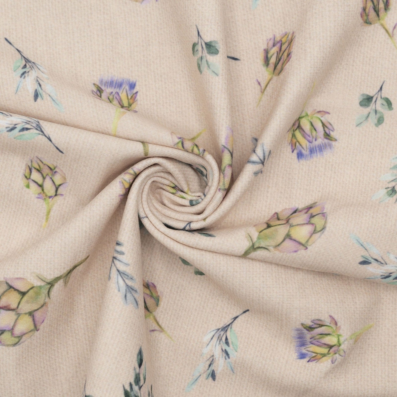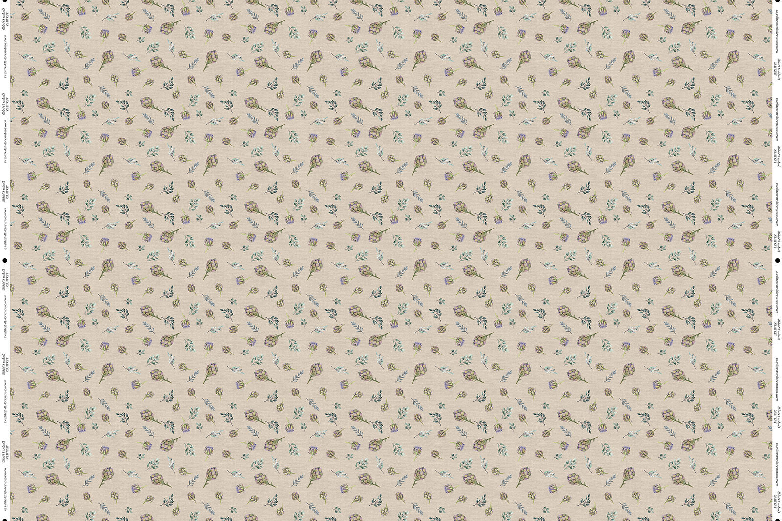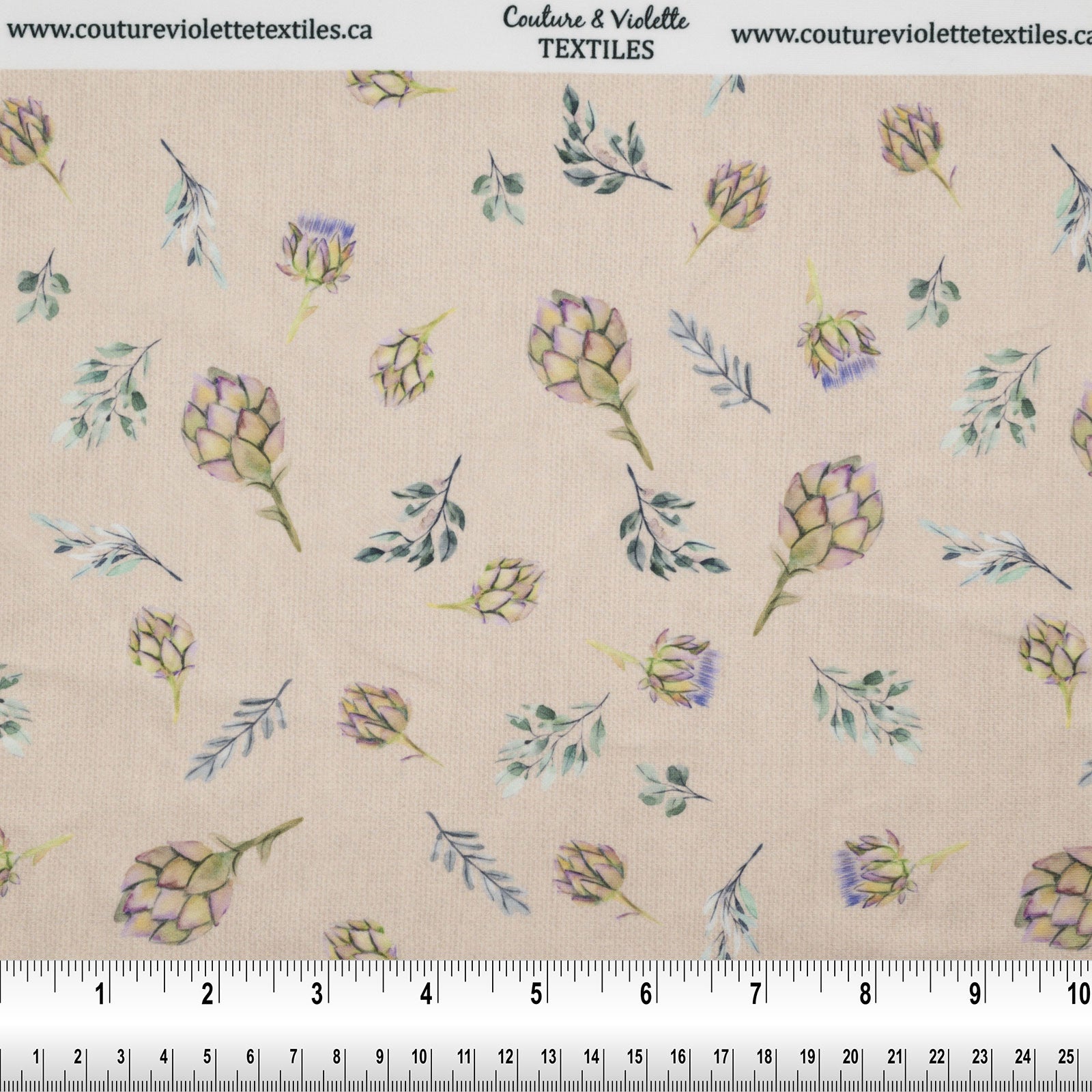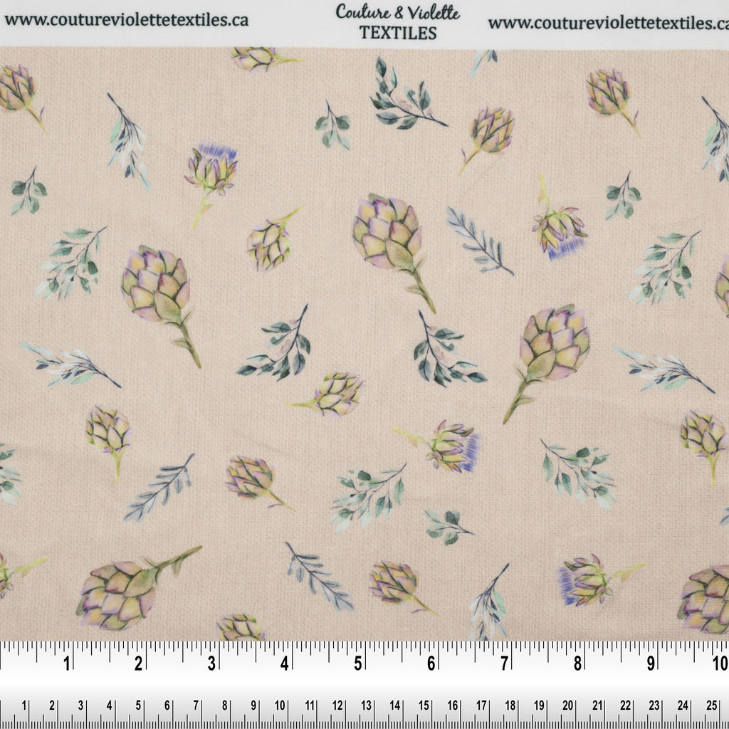 Tissu imprimé avec motifs de petits artichauts sur fond crême dans la collection Artichaut et tournesol, design unique avec un choix de tissus écoresponsable.