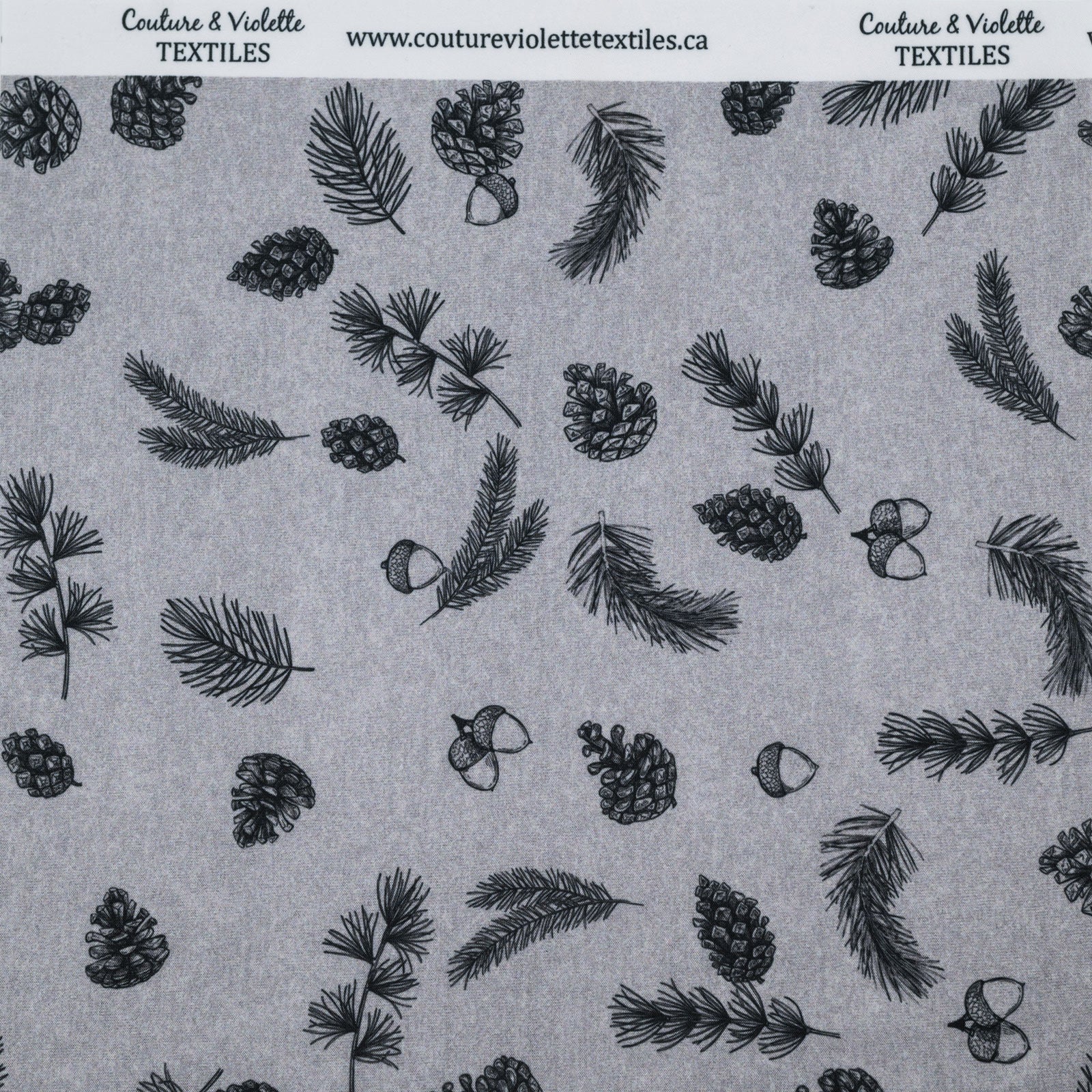 Motifs de pommes et branches de sapins et épinettes ( conifères ) sur fond gris ultime. Collection avec designs pour la confection de vêtements pour les amateurs de chasse et pêche.  Design exclusif avec un choix de tissus écoresponsable.