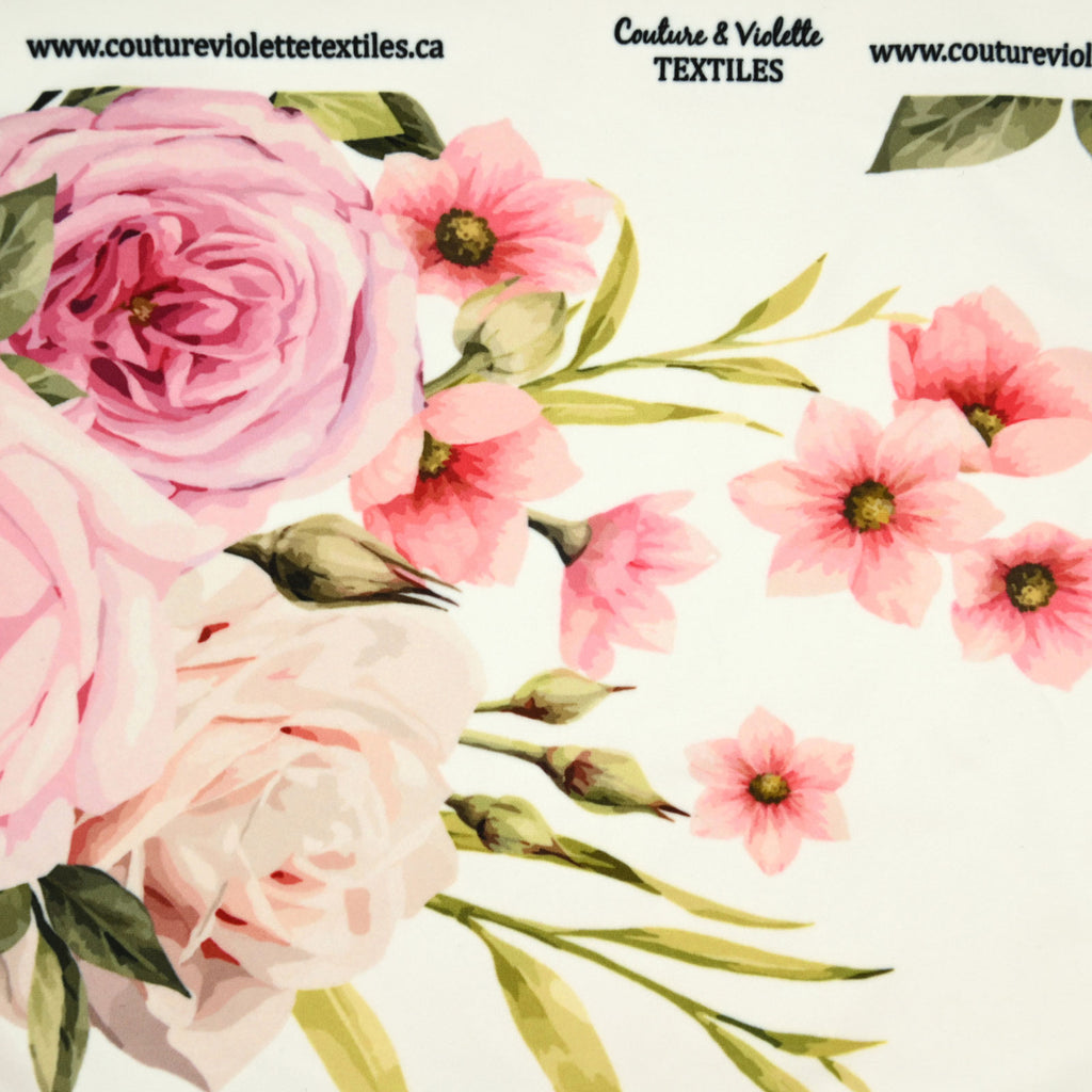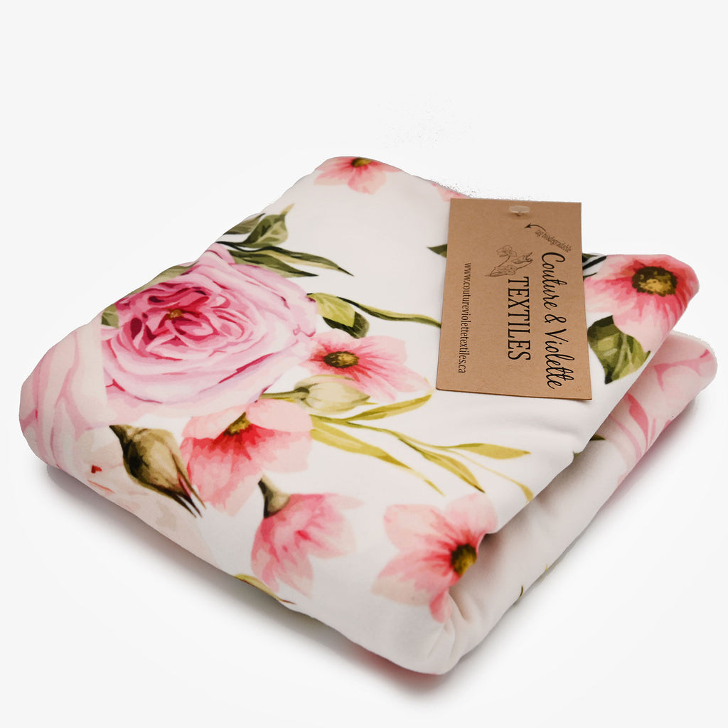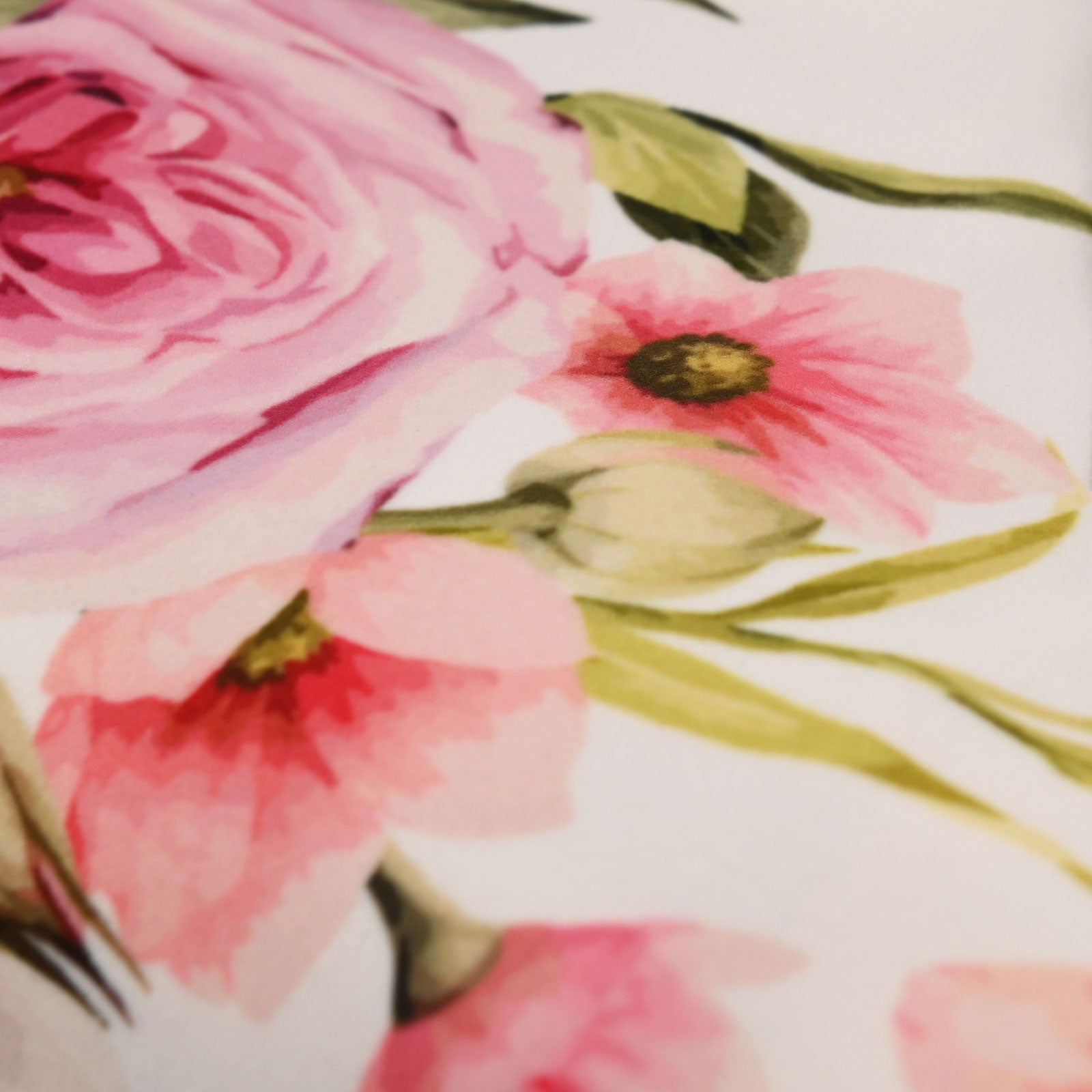 Tissu imprimé avec motifs de grandes pivoines sur fond blanc dans la collection crânes et pivoines design unique avec un choix de tissus écoresponsable.