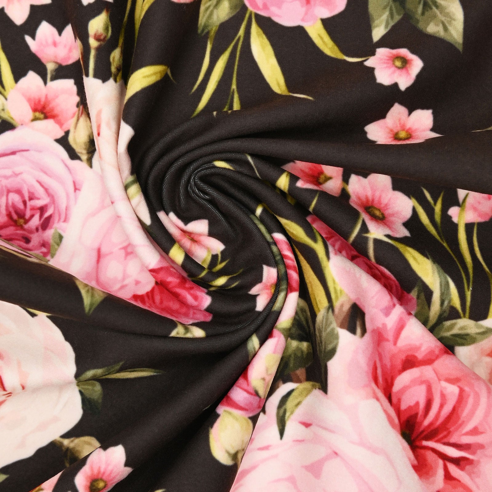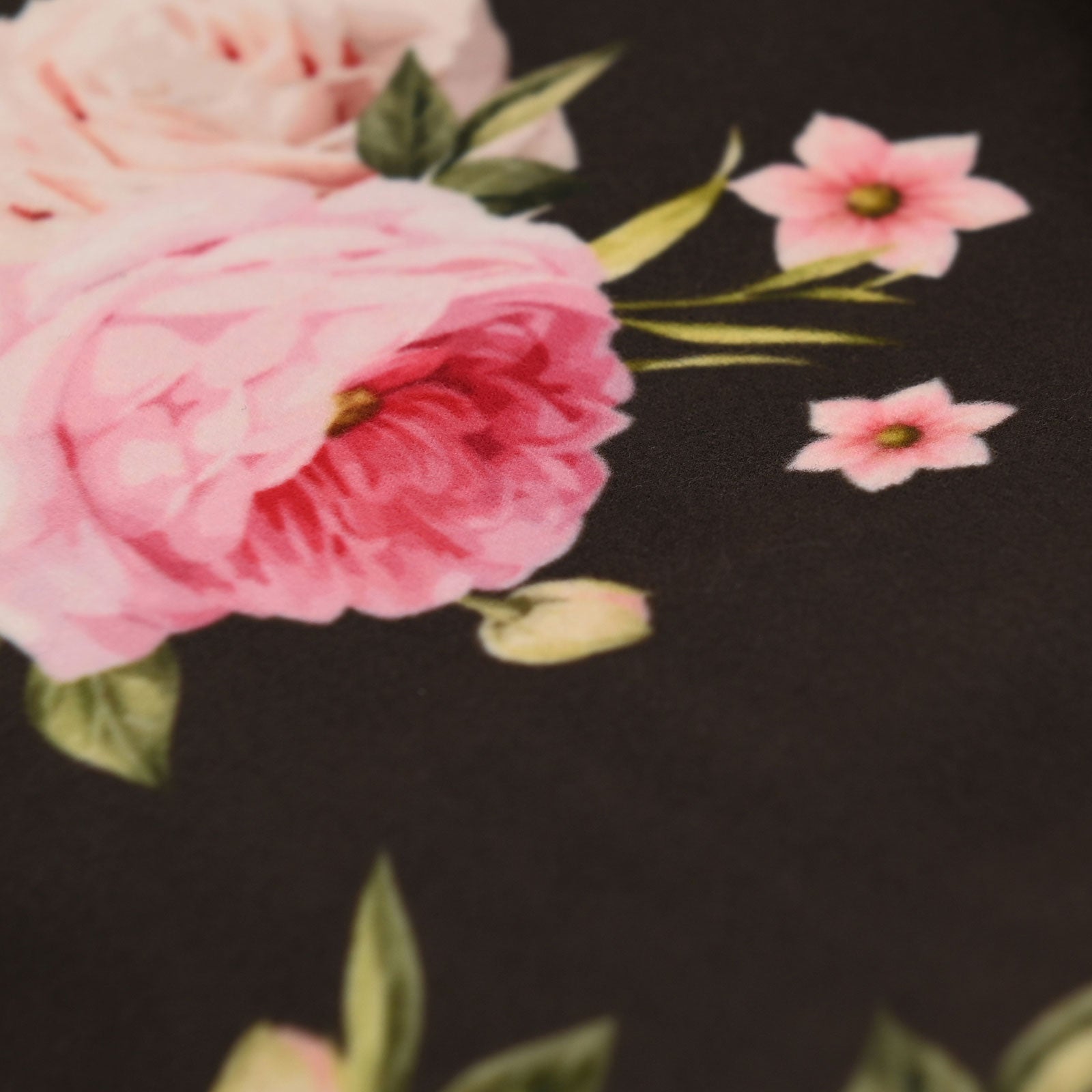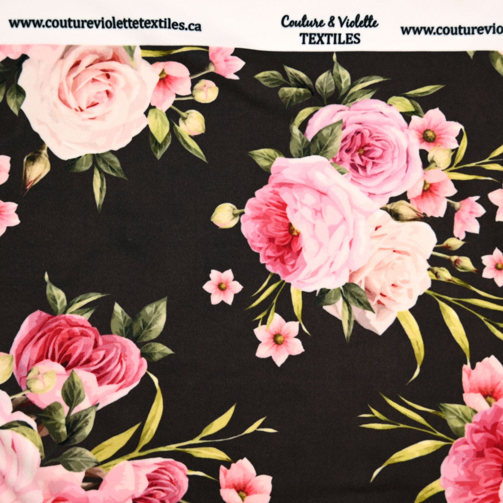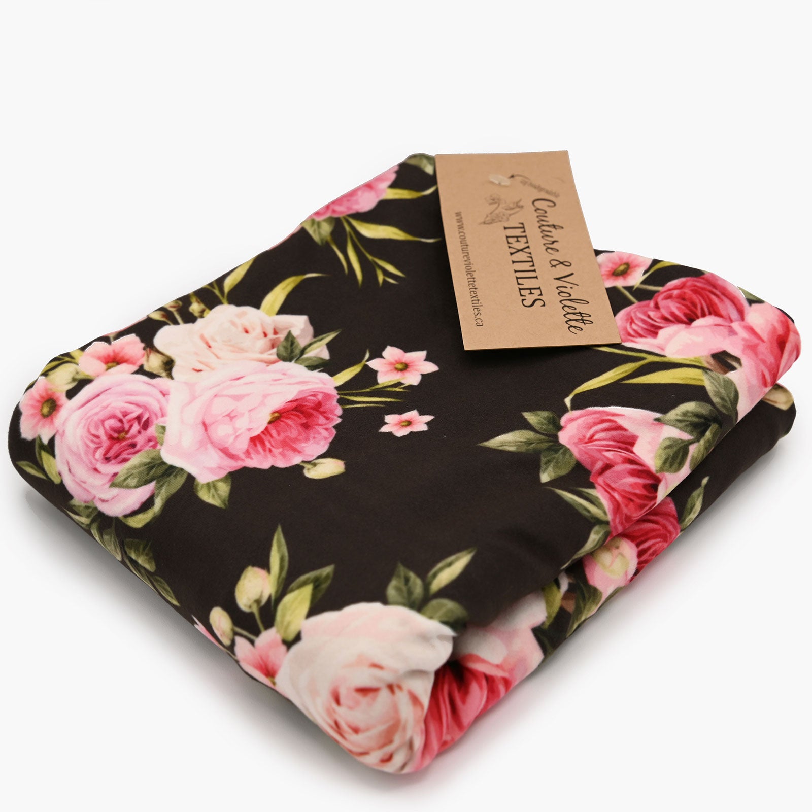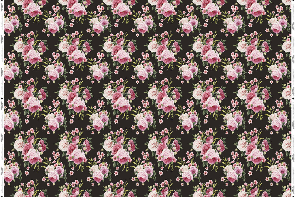 Tissu imprimé avec motifs de petites pivoines sur fond noir charbon dans la collection crânes et pivoines design unique avec un choix de tissus écoresponsable.