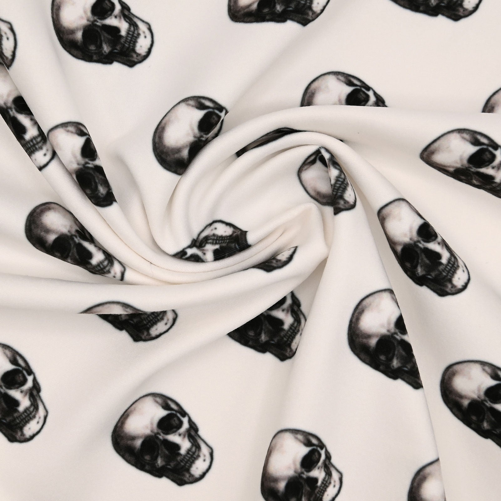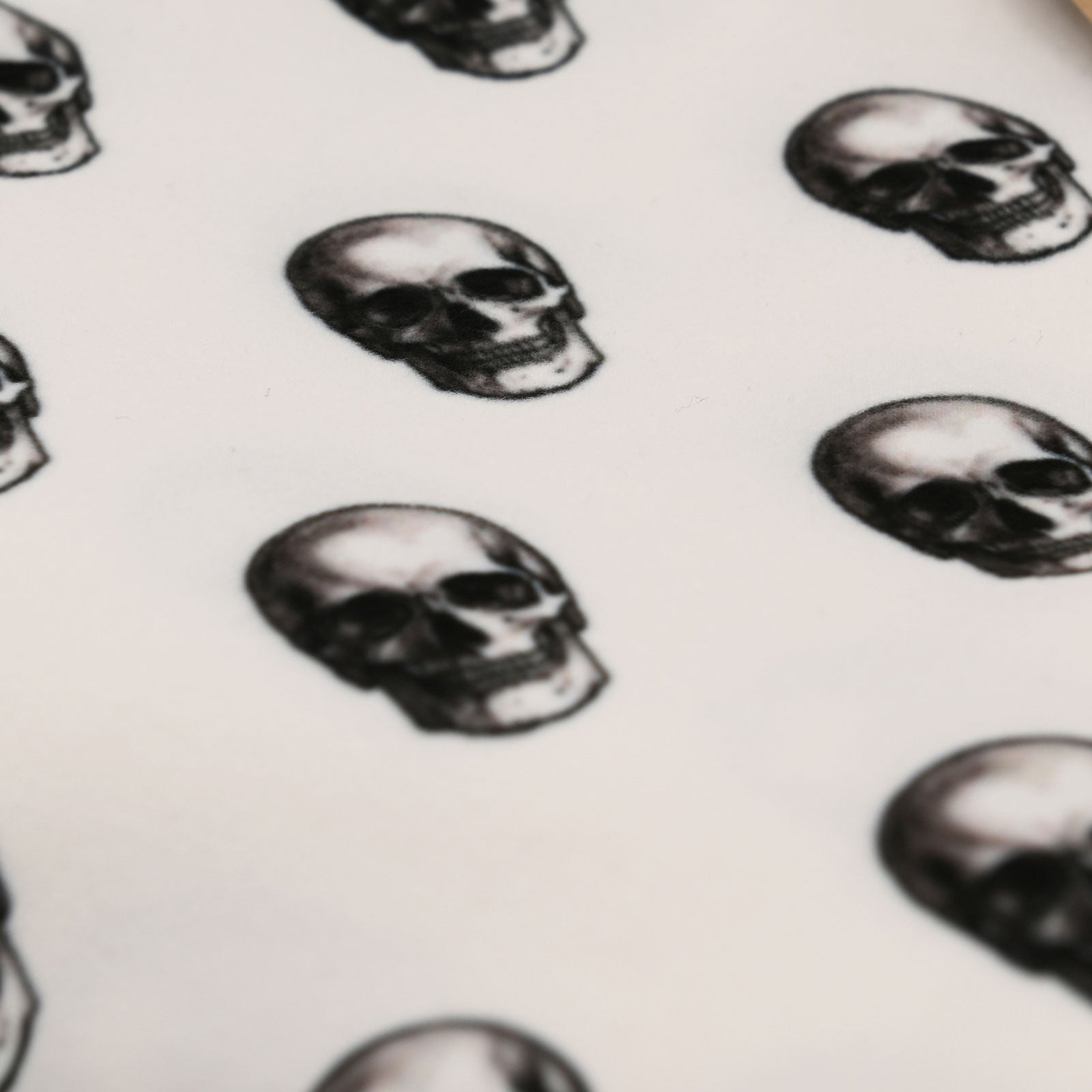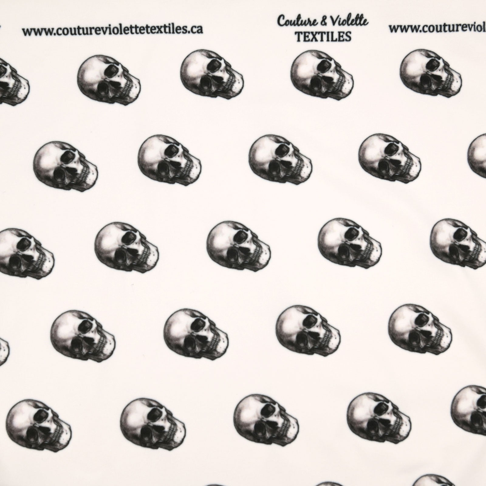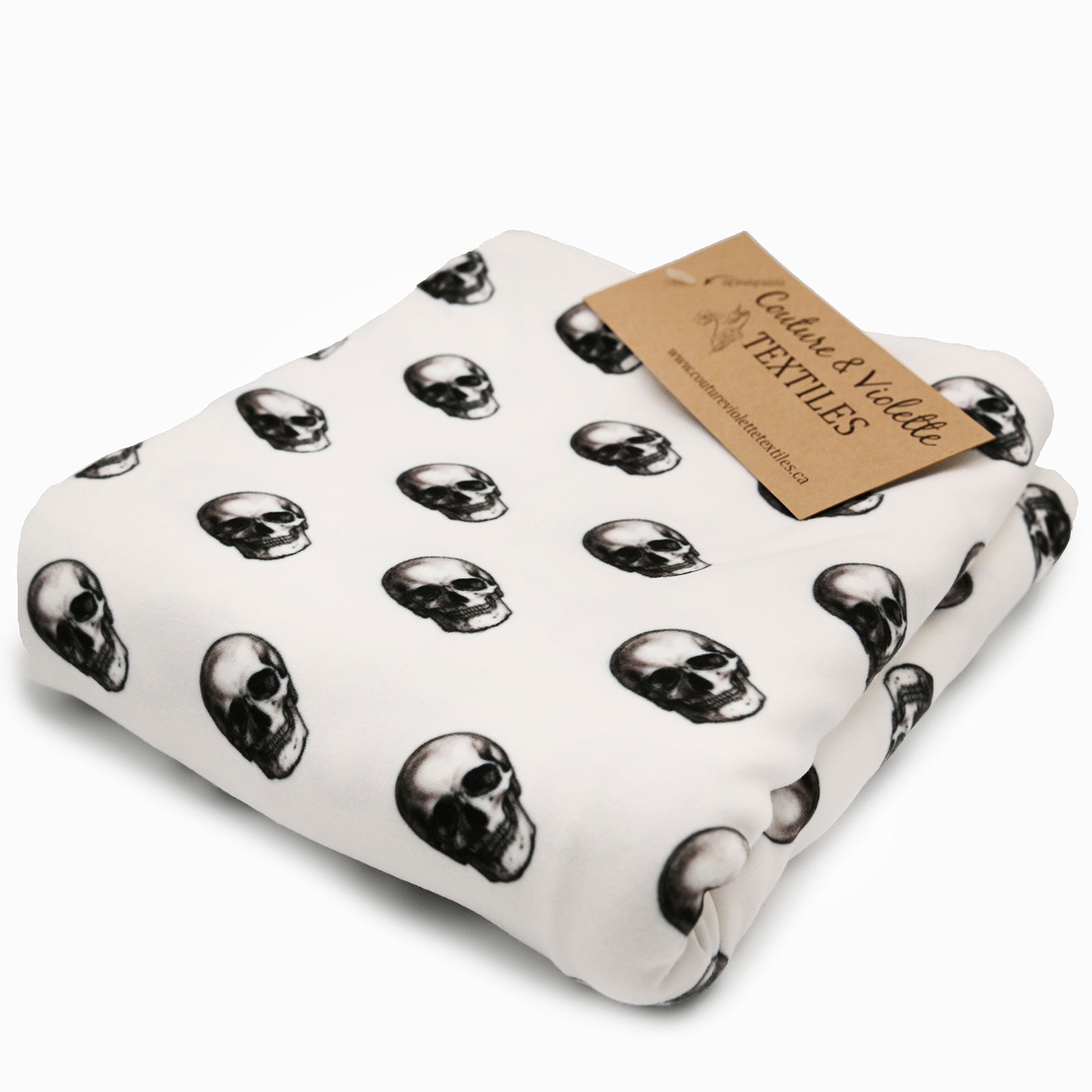 Tissu imprimé avec motifs de petits crânes sur fond blanc dans la collection crânes et pivoines design unique avec un choix de tissus écoresponsable.