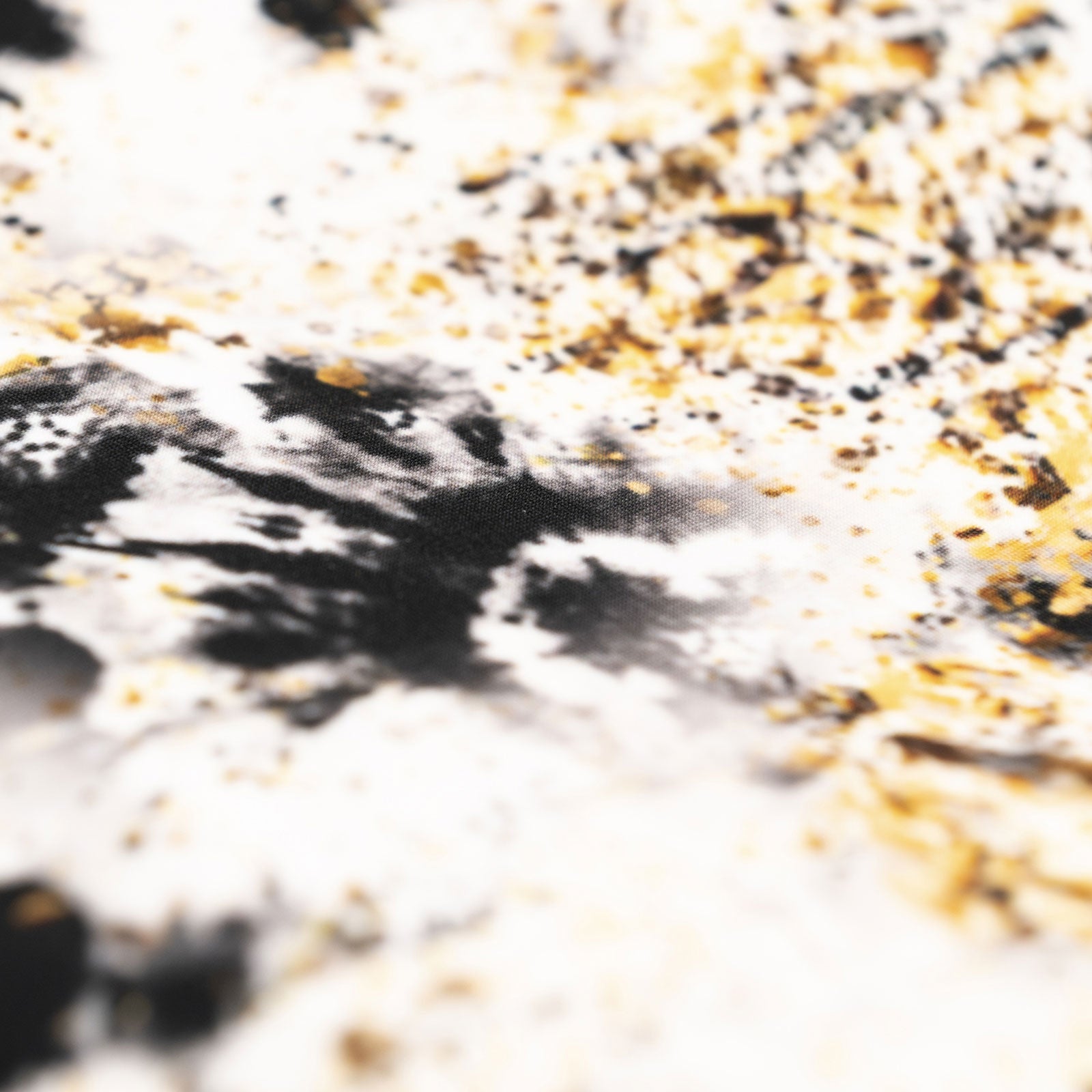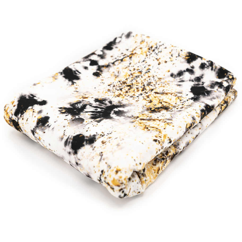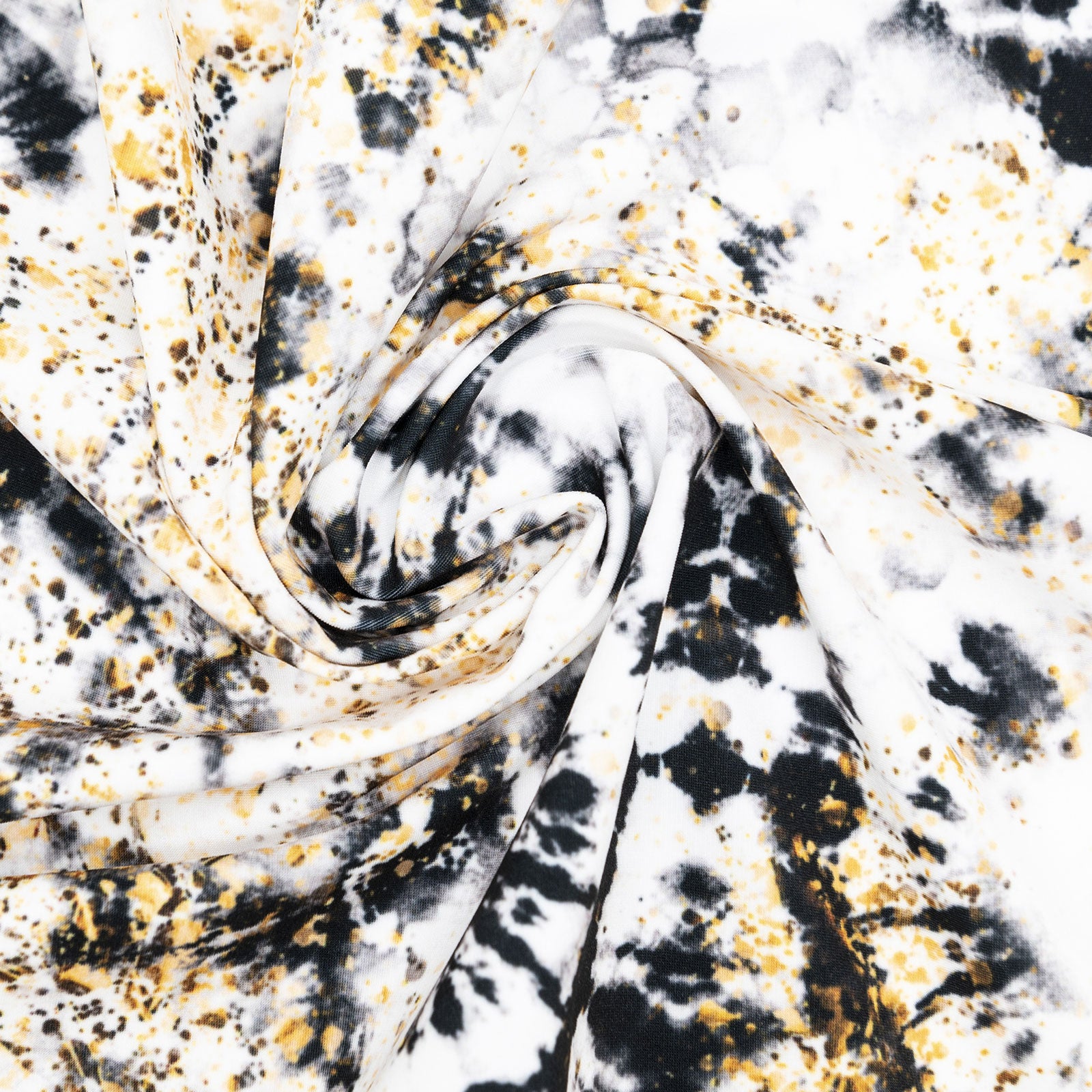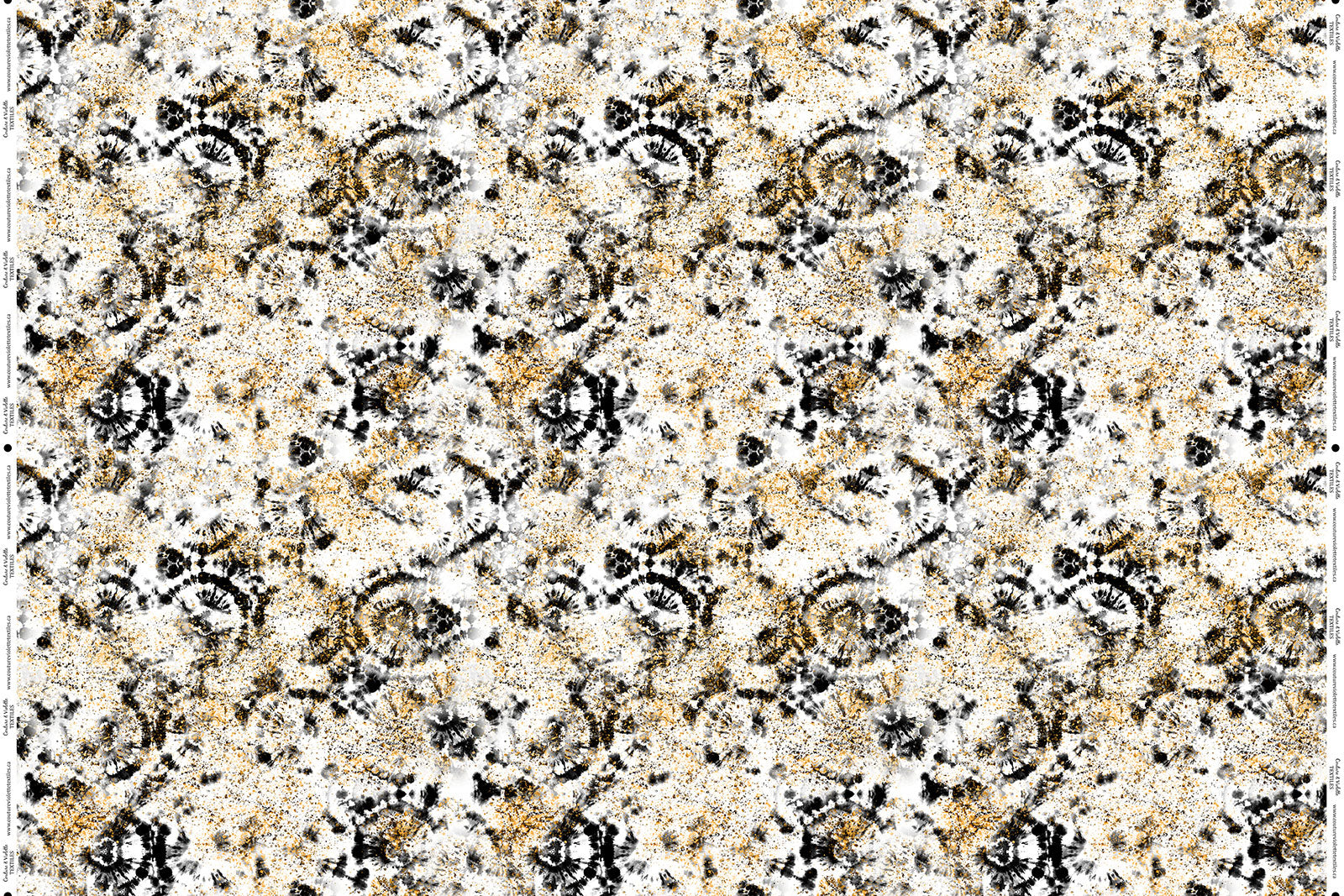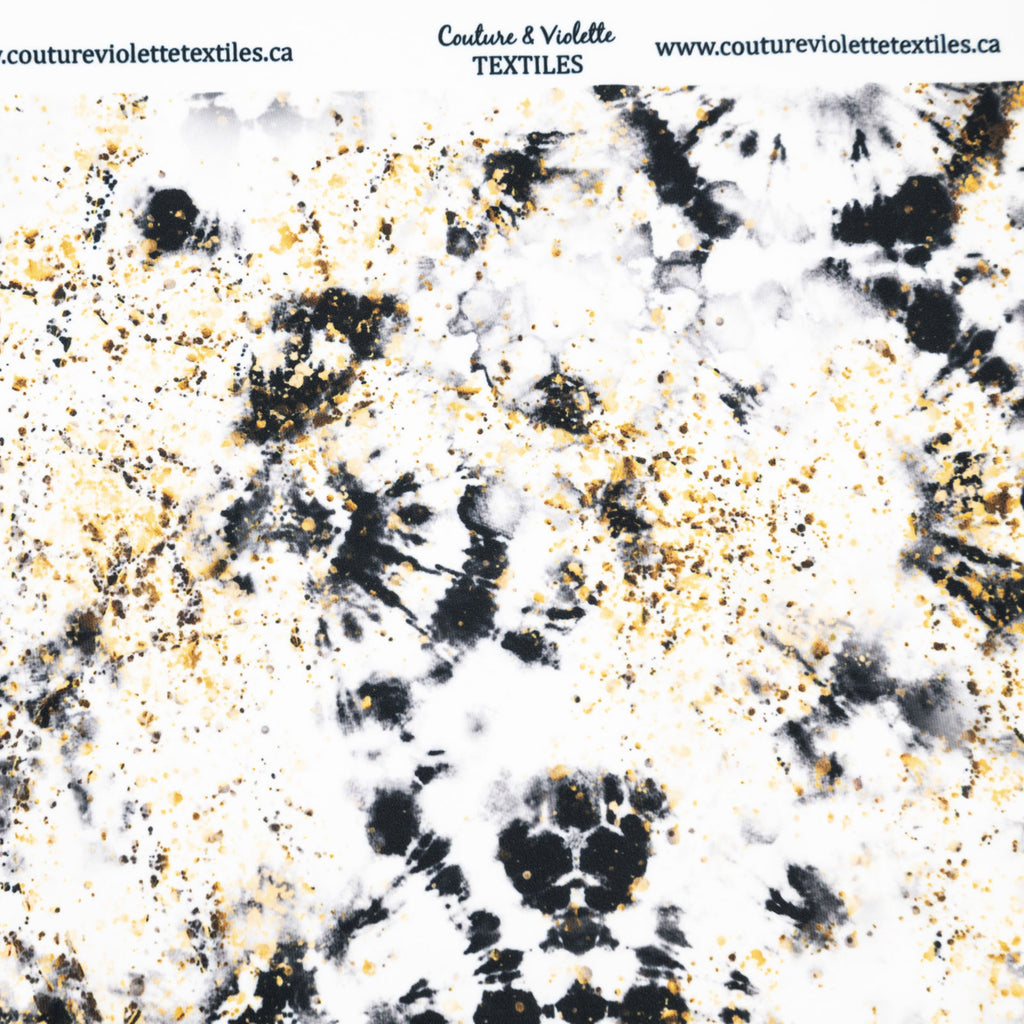Tissu imprimé avec motifs tie dye noir et poussière or sur fond blanc dans la collection noir et or design unique avec un choix de tissus écoresponsable.