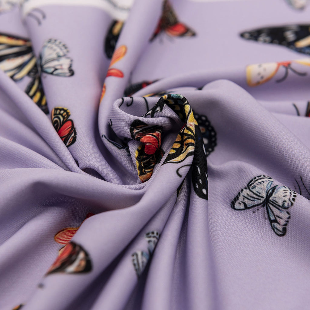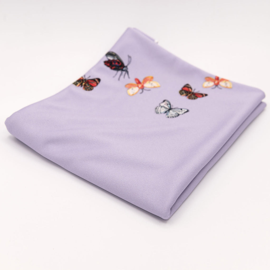 Tissu imprimé avec magnifiques motifs de papillons imprimés sur la bordure sur fond lilas dans la collection papillon design unique avec un choix de tissus écoresponsable.