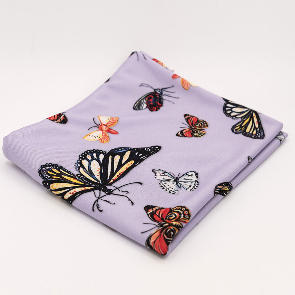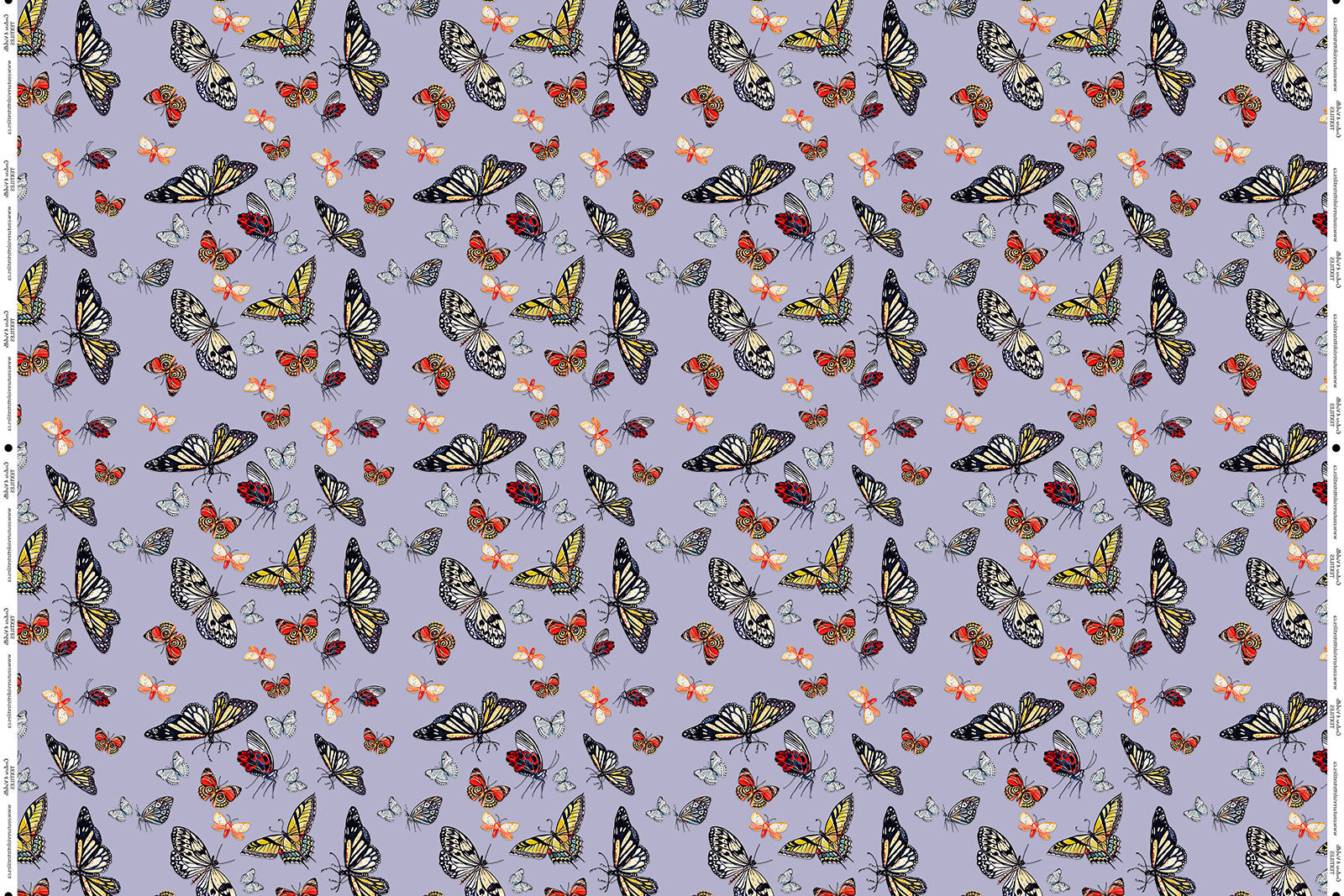 Tissu imprimé avec magnifiques motifs de papillons sur fond lilas dans la collection papillon design unique avec un choix de tissus écoresponsable.