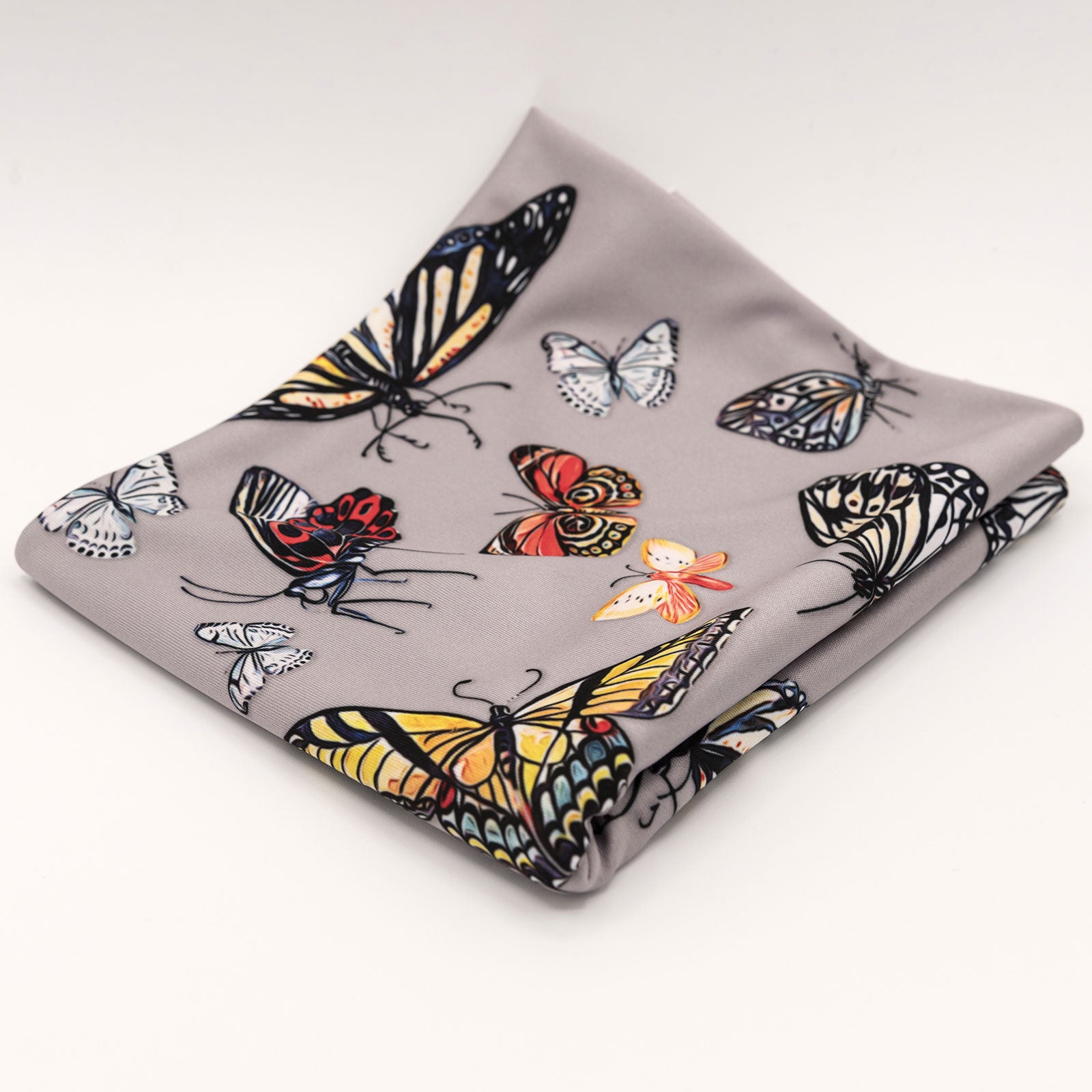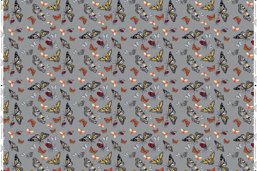 Tissu imprimé avec magnifiques motifs de papillons sur fond gris ultime dans la collection papillon design unique avec un choix de tissus écoresponsable.
