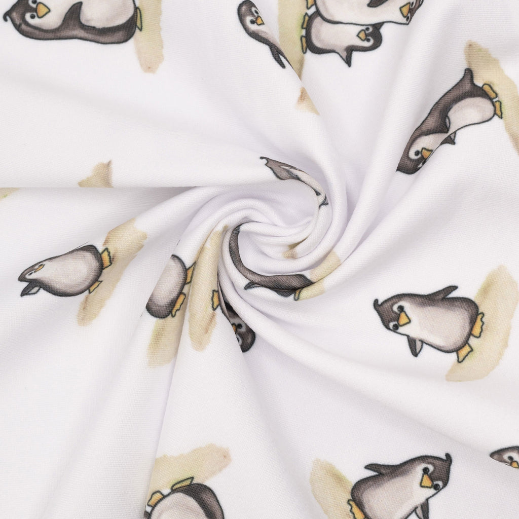 Tissu imprimé avec motifs de petits pingouins sur fond bleu nuageux dans la collection Petits animaux, design unique avec un choix de tissus écoresponsable.