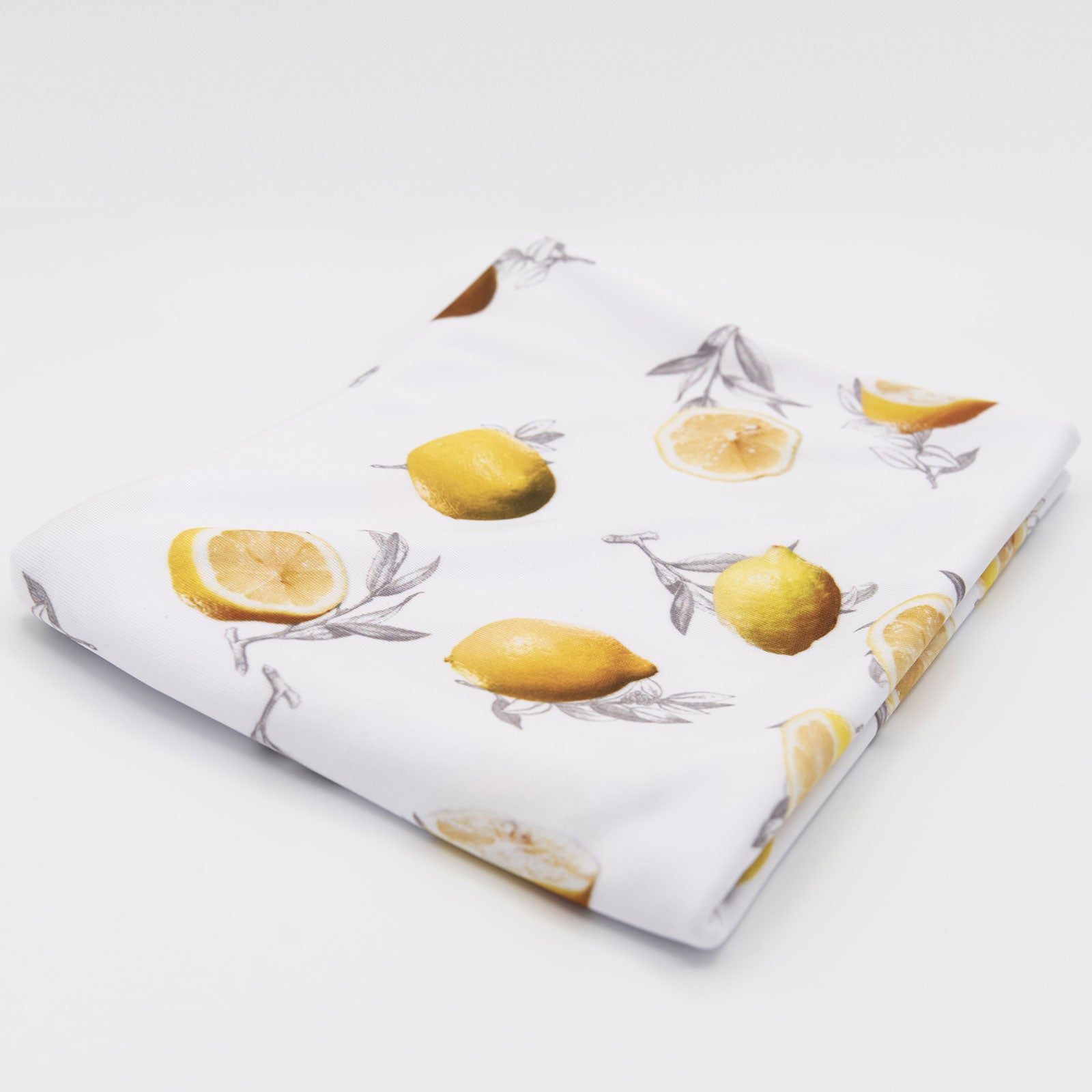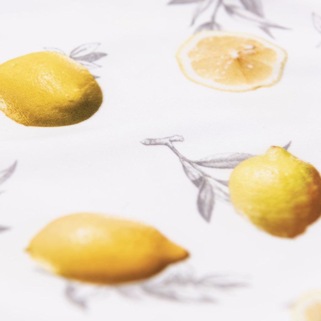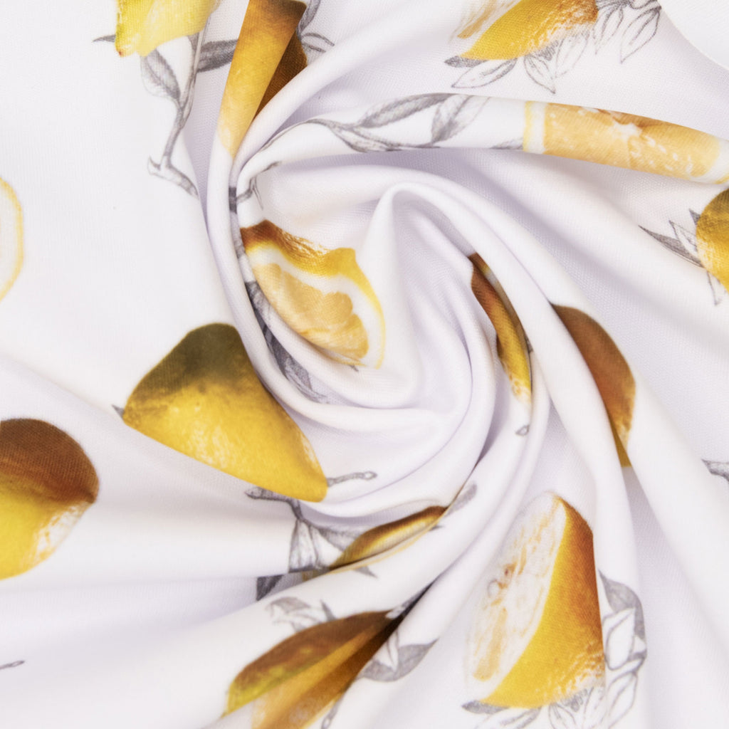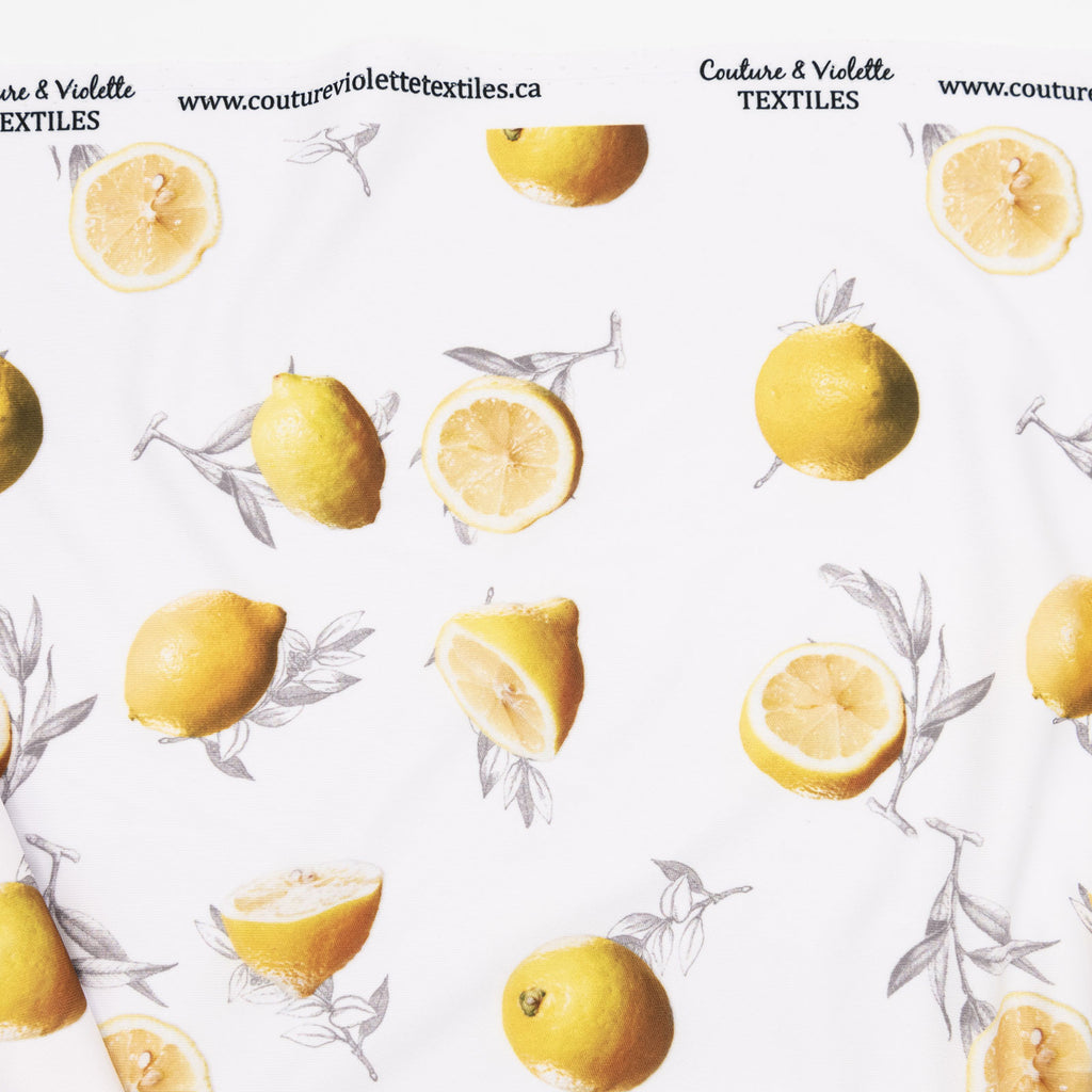 Tissu imprimé avec motifs de citrons sur fond blanc dans la collection salade de fruits  design unique avec un choix de tissus écoresponsable.