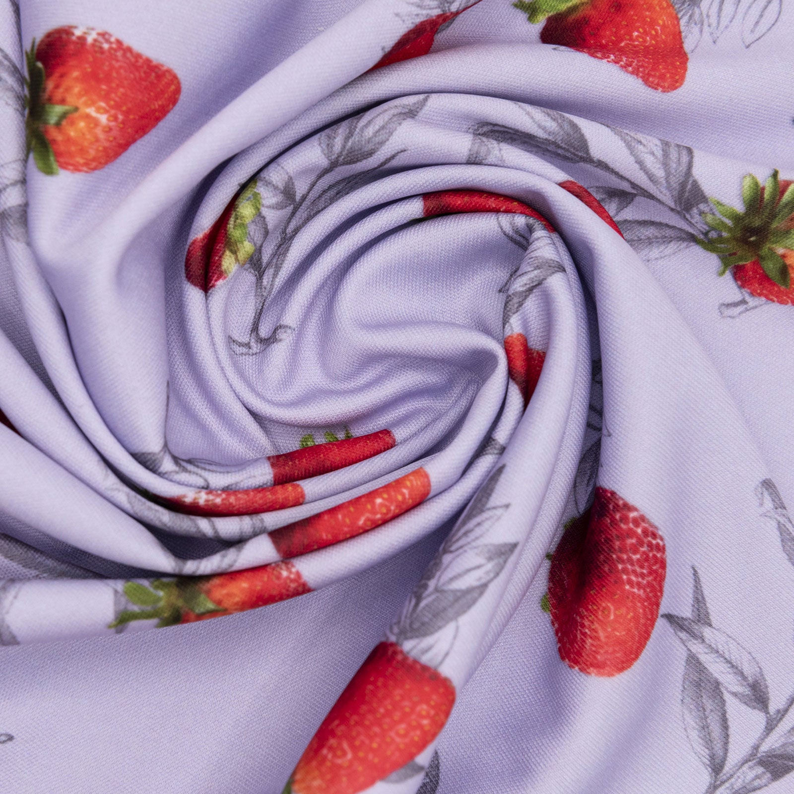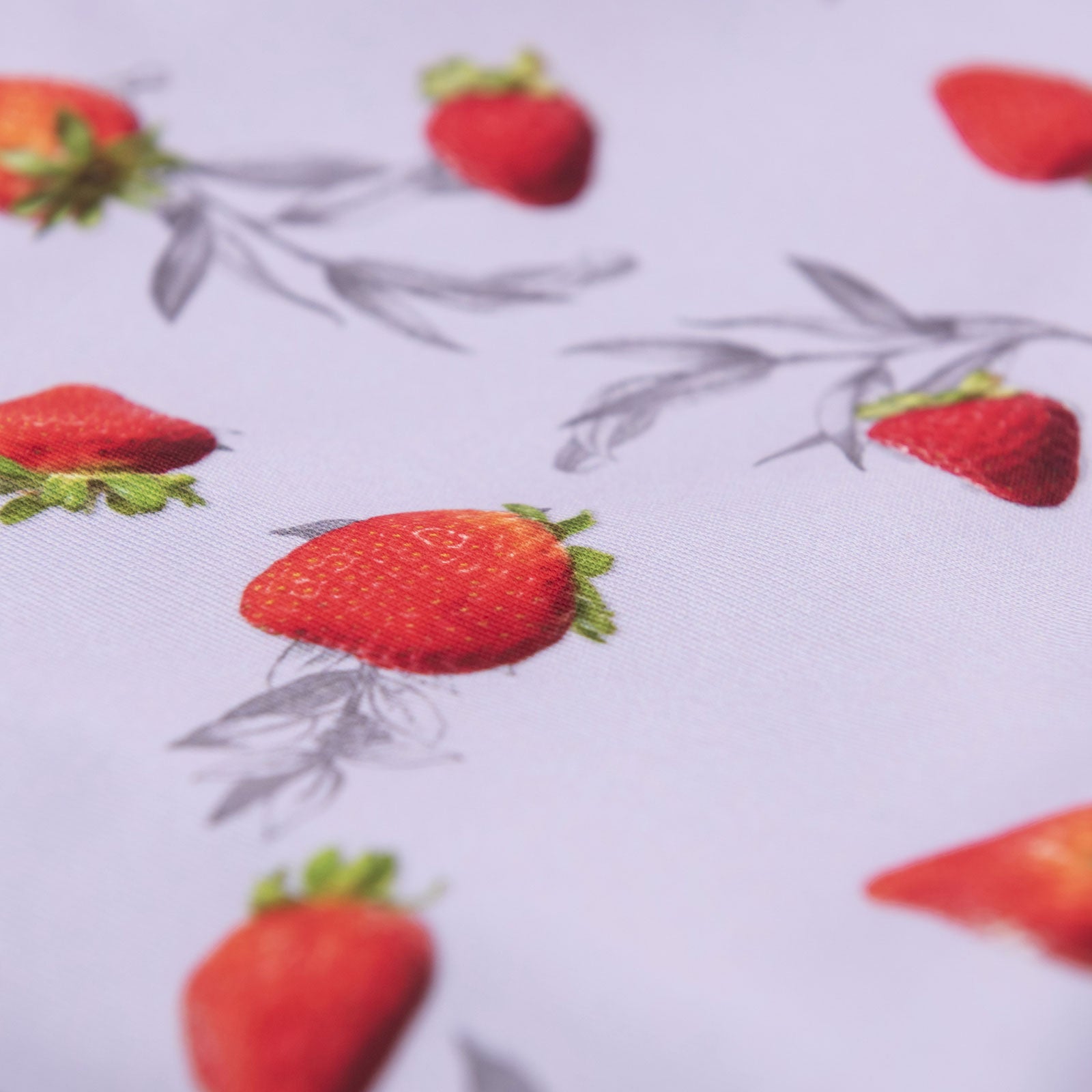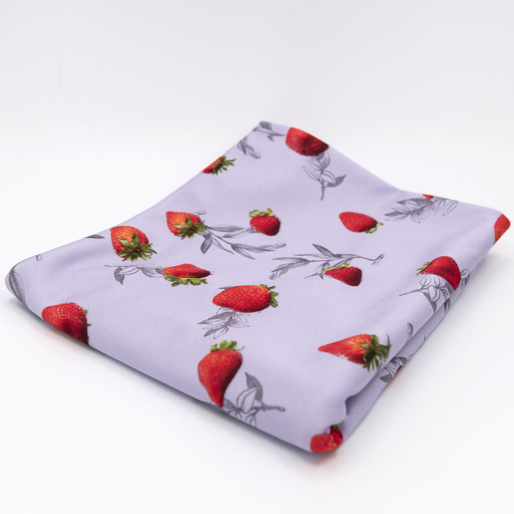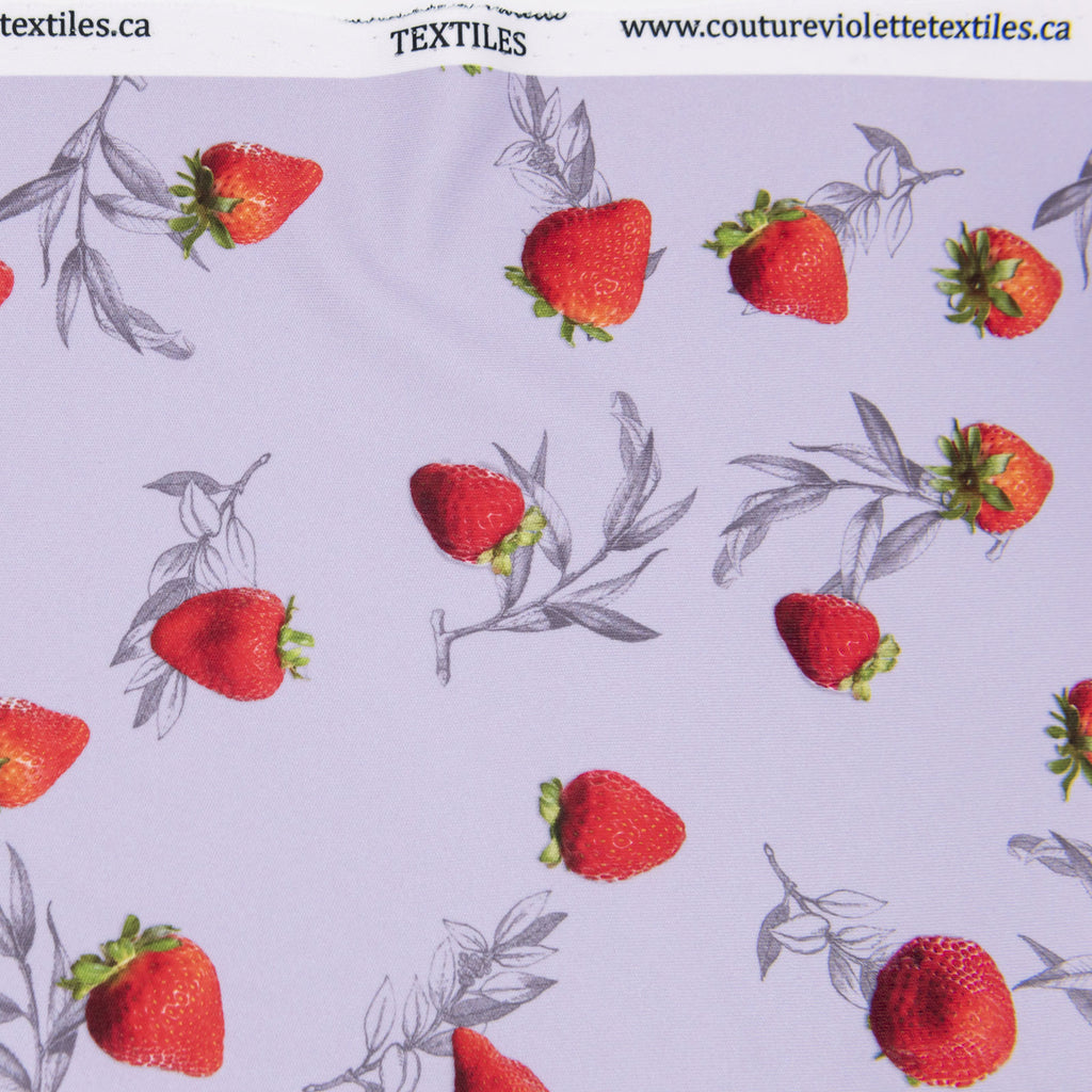 Tissu imprimé avec motifs de fraises sur fond dusty lilac dans la collection salade de fruits  design unique avec un choix de tissus écoresponsable.