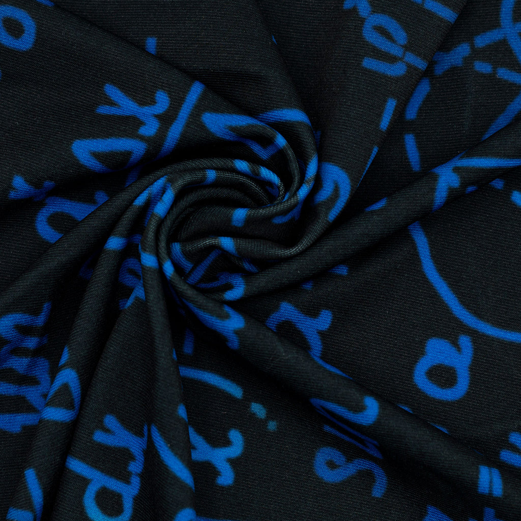 Tissu imprimé avec motifs de grands symboles et calculs d'algèbres bleu sur fond noir dans la collection techno - algèbre, design unique avec un choix de tissus écoresponsable.