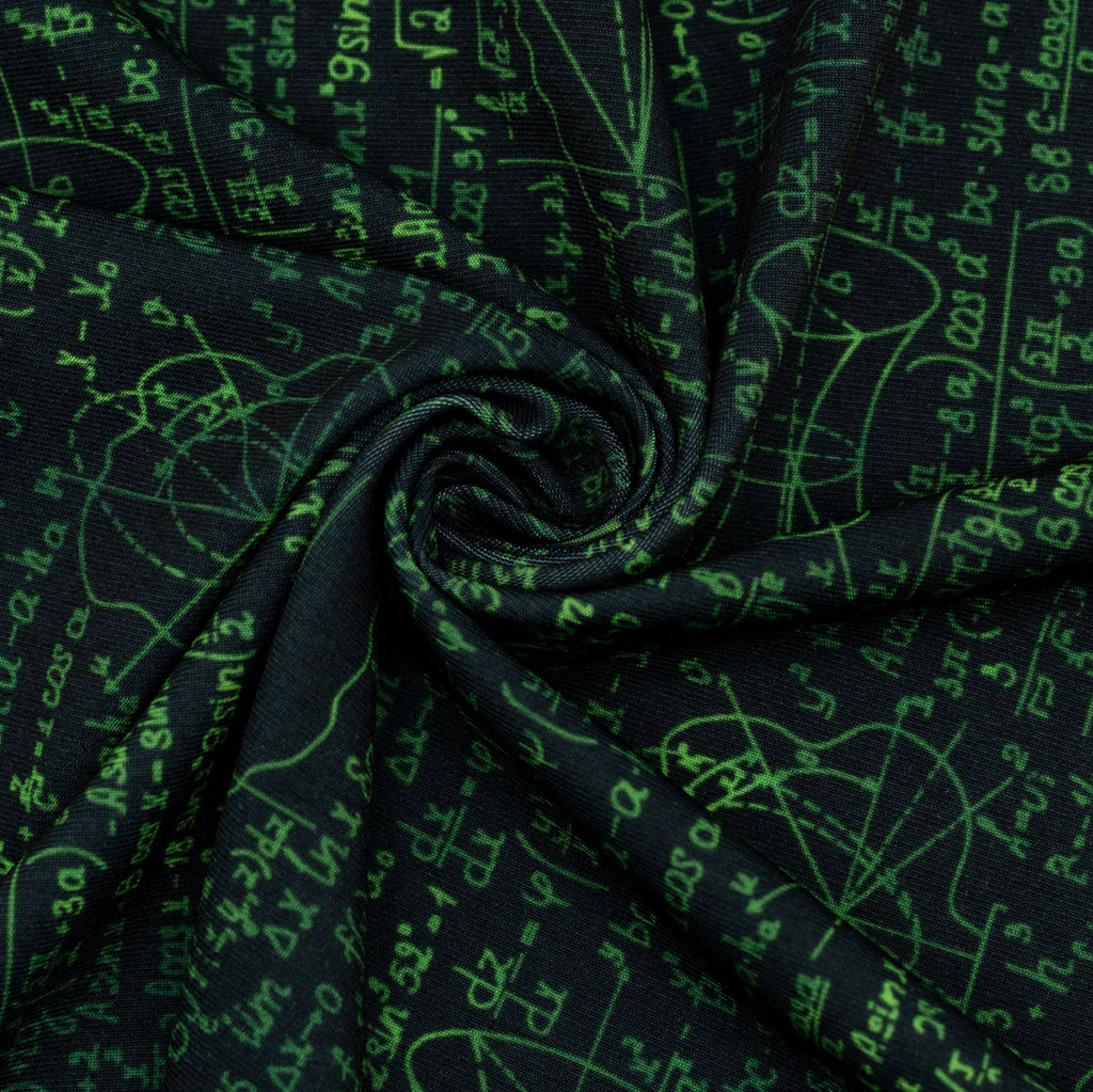 Tissu imprimé avec motifs de petits symboles et calculs d'algèbres verts sur fond noir dans la collection techno - algèbre, design unique avec un choix de tissus écoresponsable.