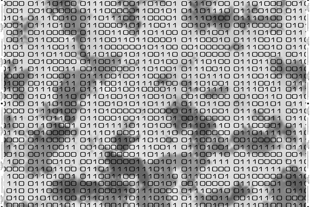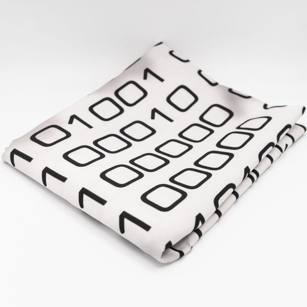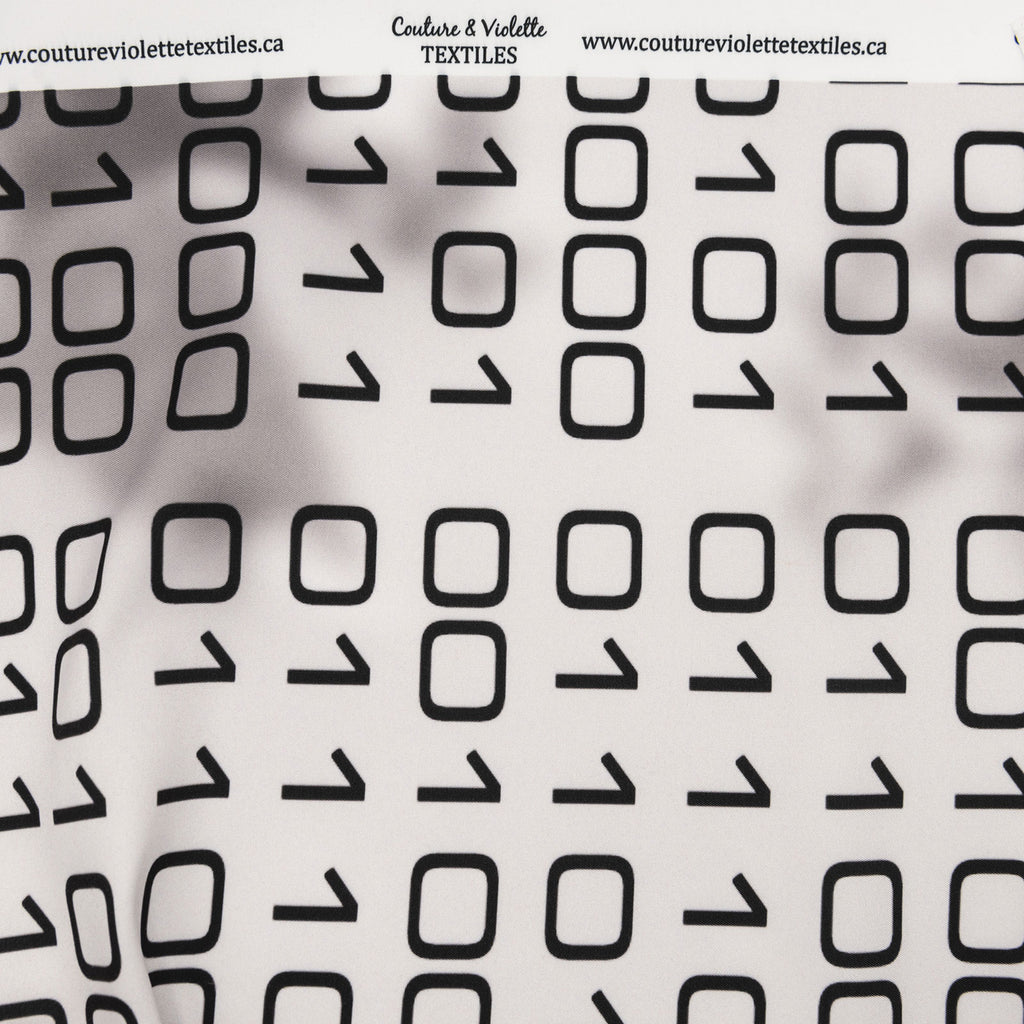 Tissu imprimé avec motifs de grand code binaire noir sur fond gris dans la collection techno design unique avec un choix de tissus écoresponsable.