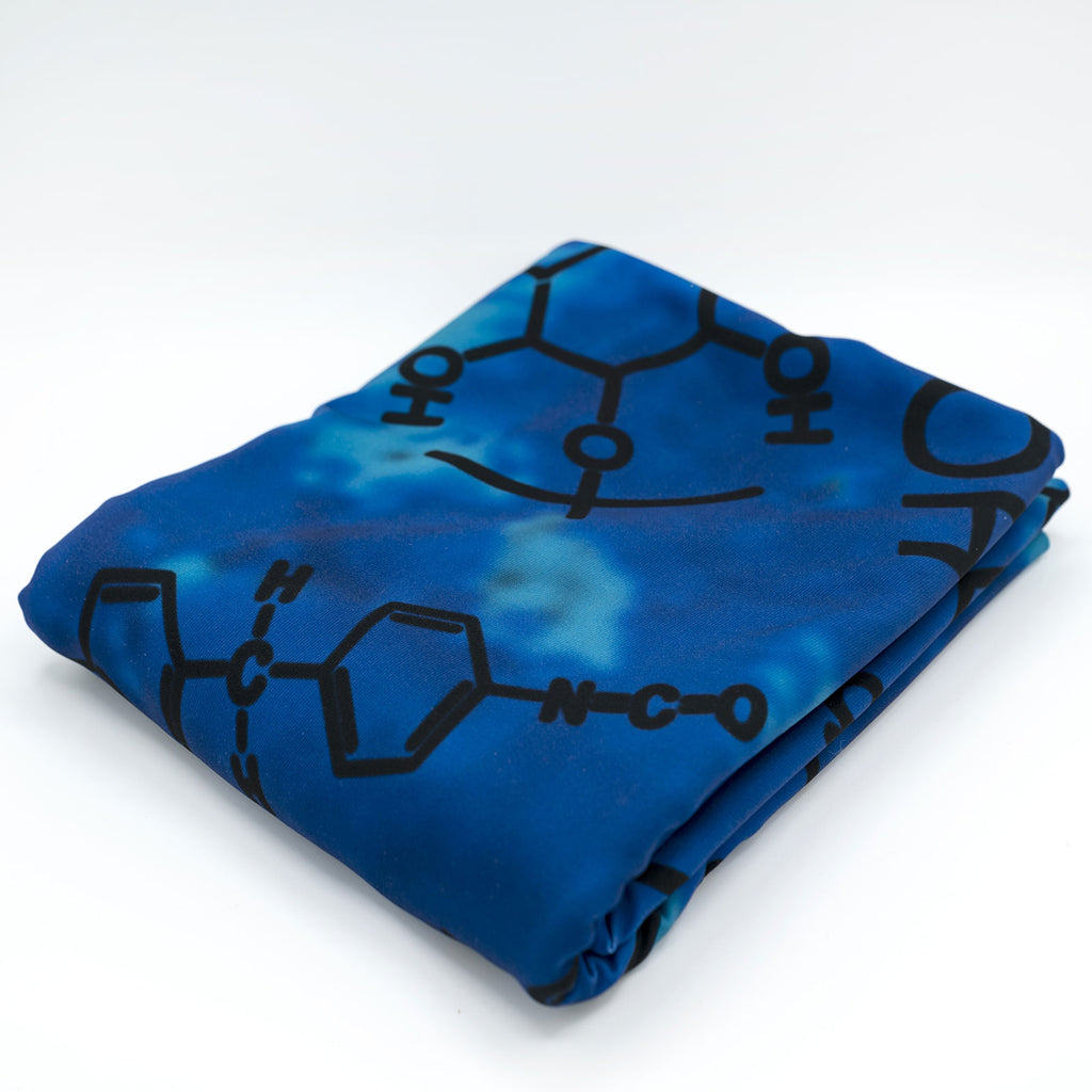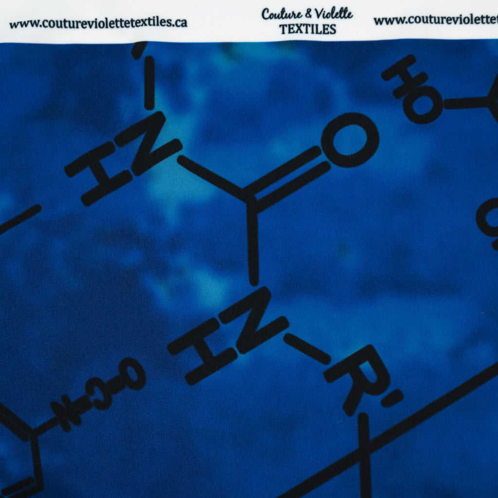 Tissu imprimé avec motifs de grandes molécules noires sur fond bleu dans la collection techno design unique avec un choix de tissus écoresponsable.