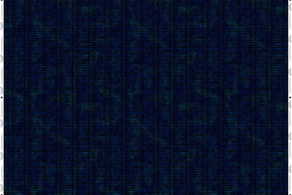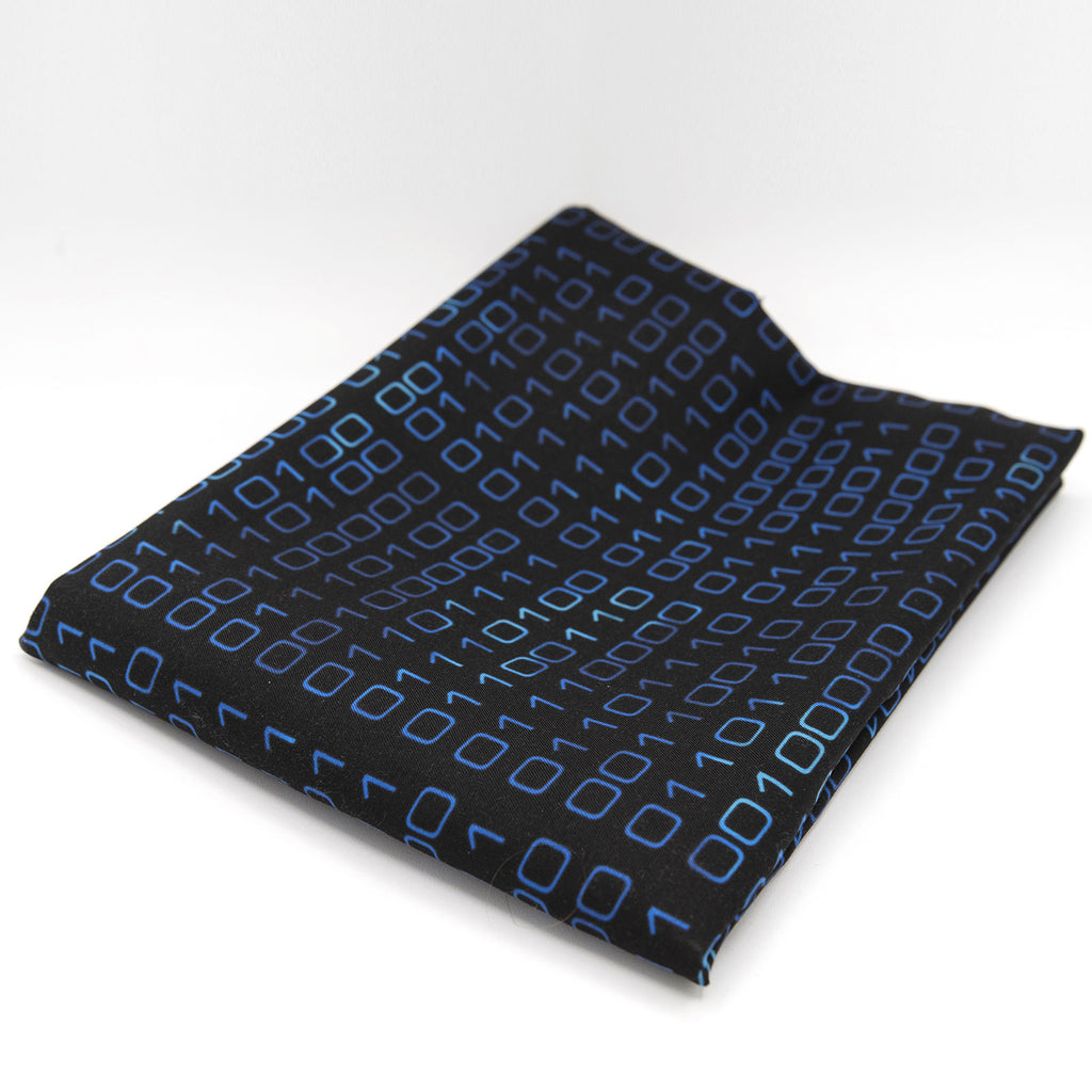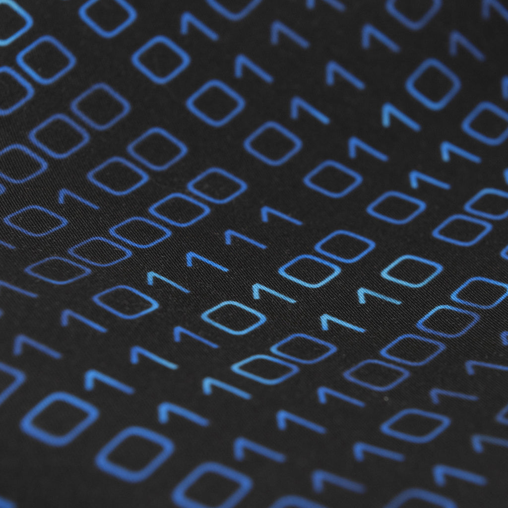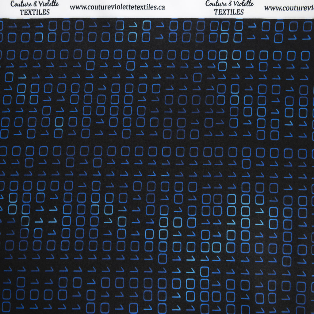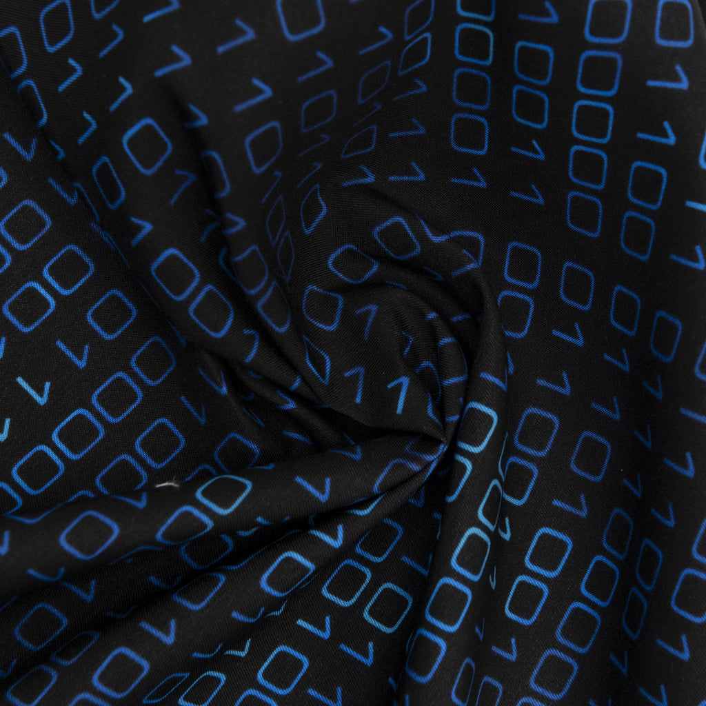 Tissu imprimé avec motif de petit code binaire bleu sur fond noir dans la collection techno design unique avec un choix de tissus écoresponsable.