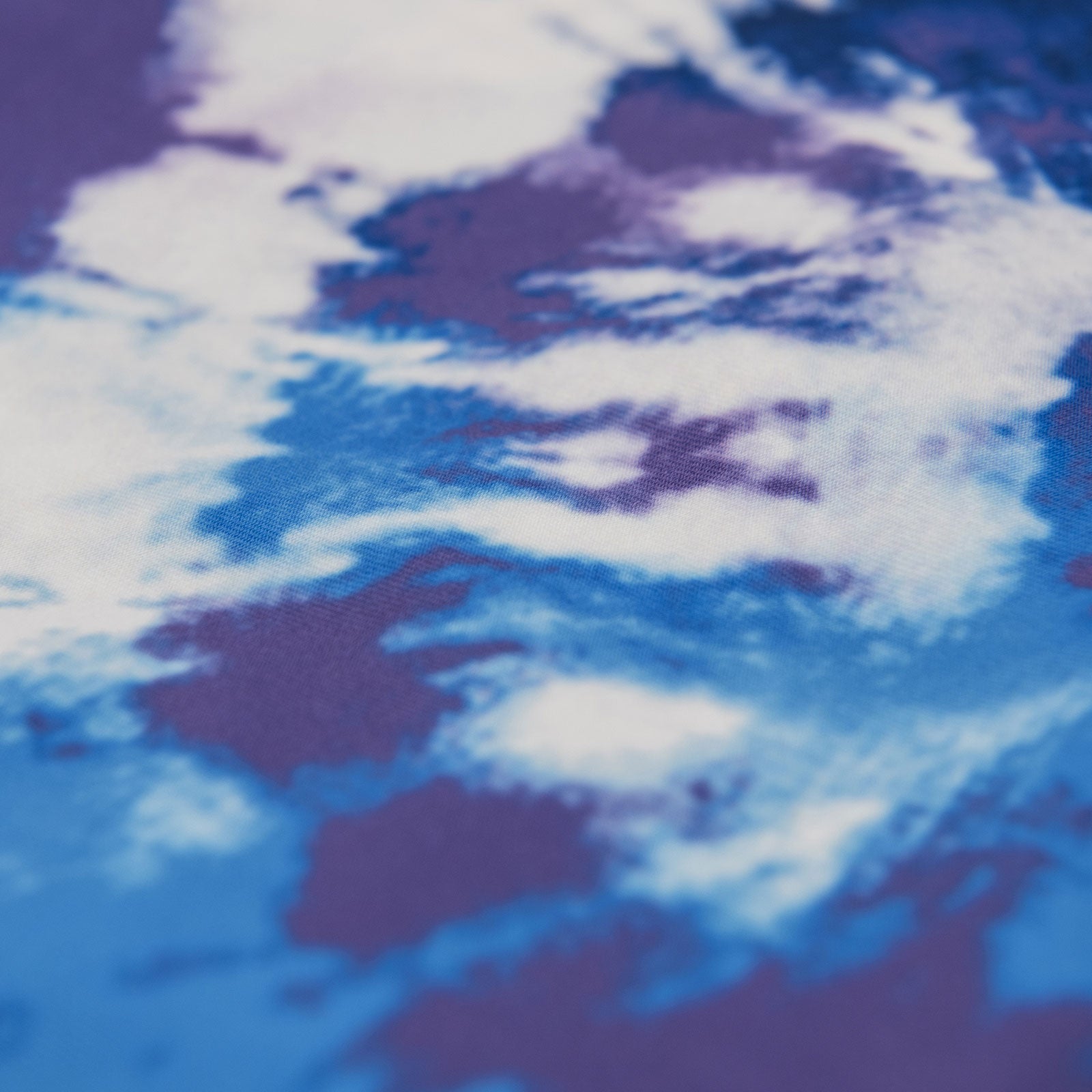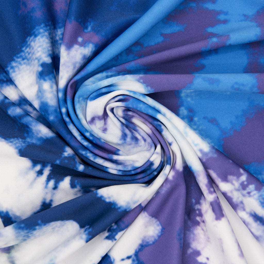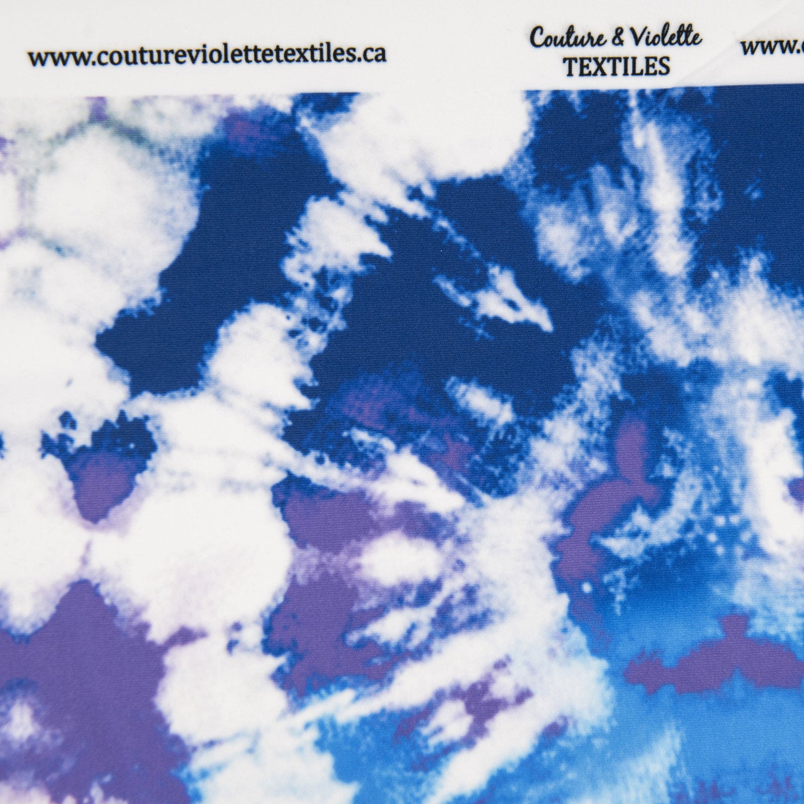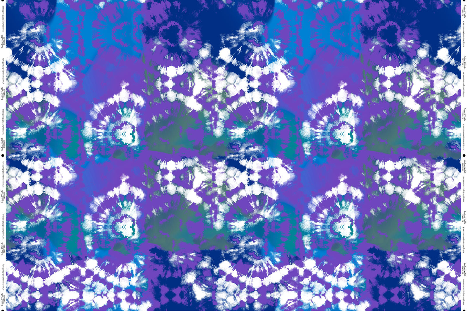 Tissu avec motifs tendances tie dye de couleur mauve et bleu sur fond blanc dans la collection Tie Dye design unique avec un choix de tissus écoresponsable