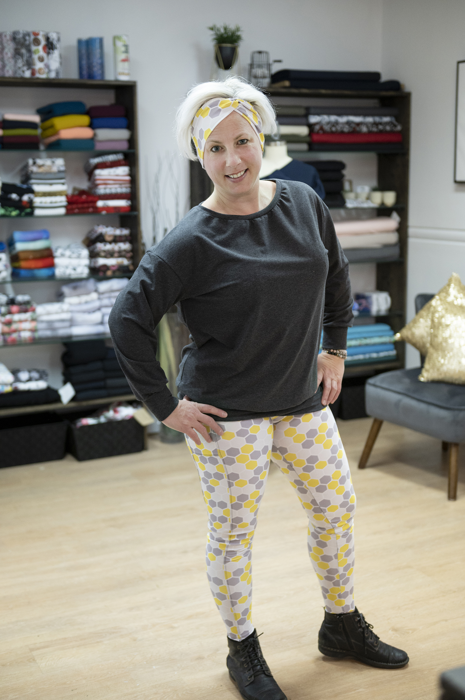 Legging confectionné dans le textile Chitosanté à compression moyenne, offrant un maintien équilibré, une extensibilité confortable et une sensation douce au contact de la peau. Réalisé avec le motif Spring Fling – Ruche jaune et gris, il combine performance textile et esthétique graphique.